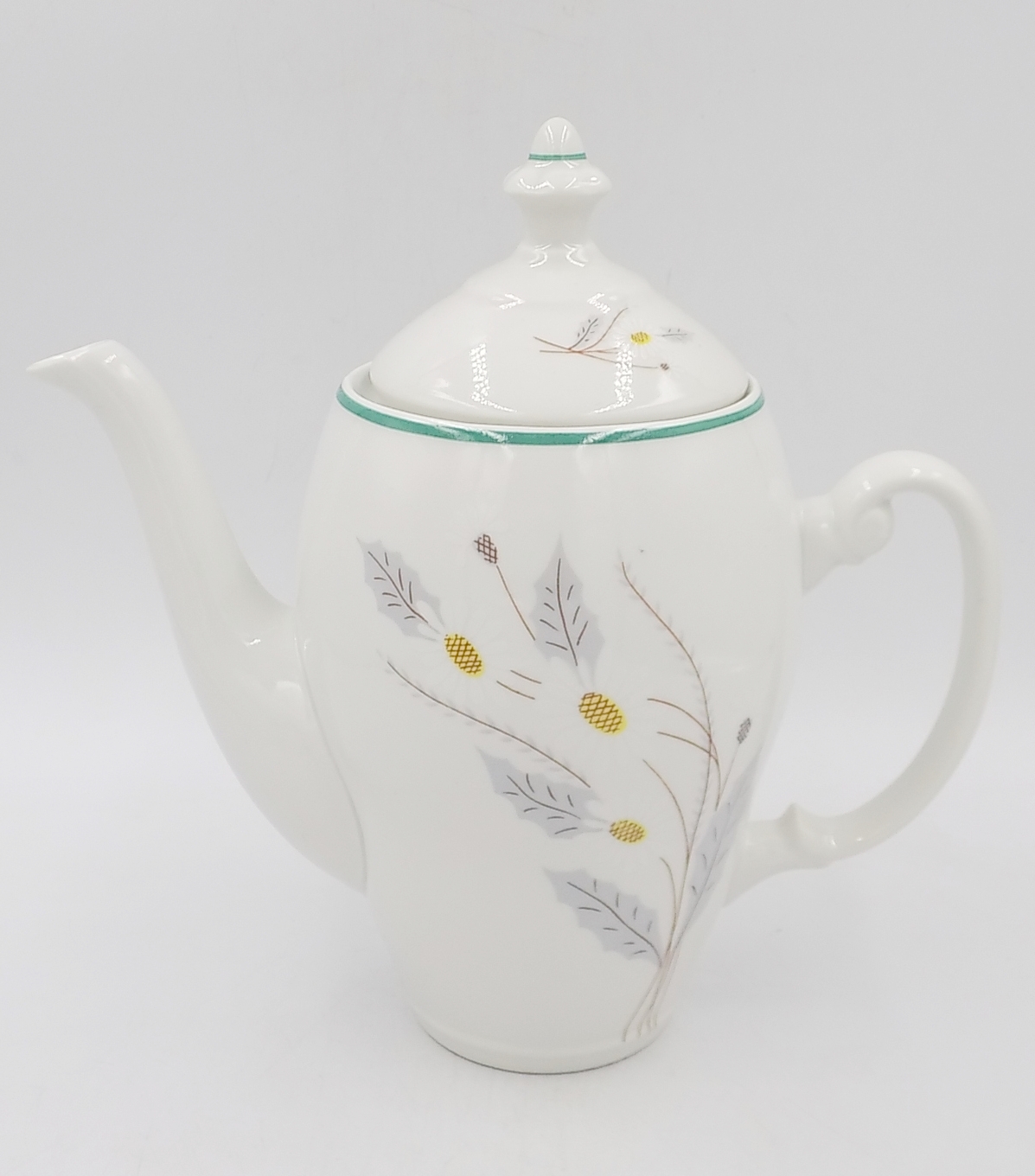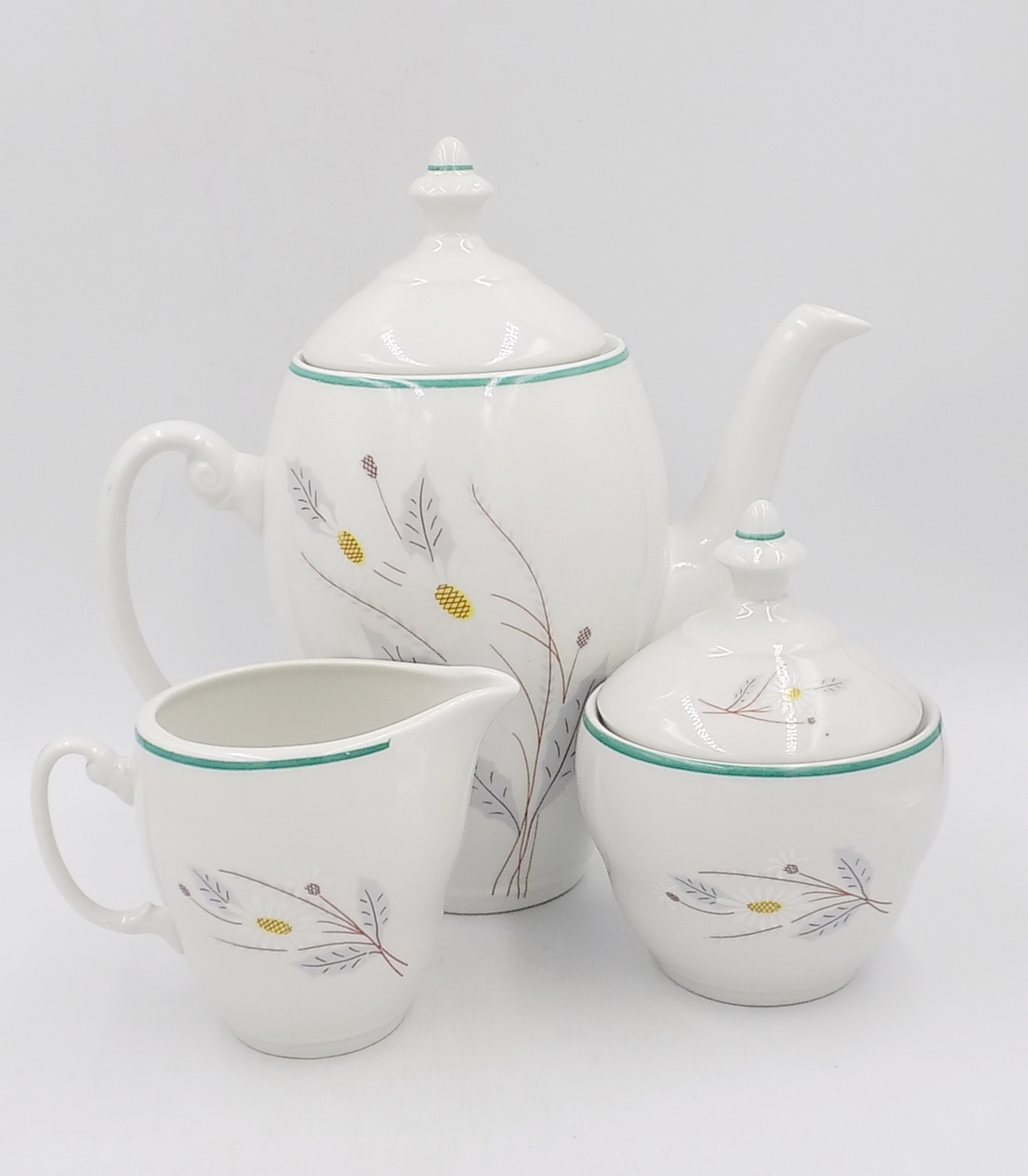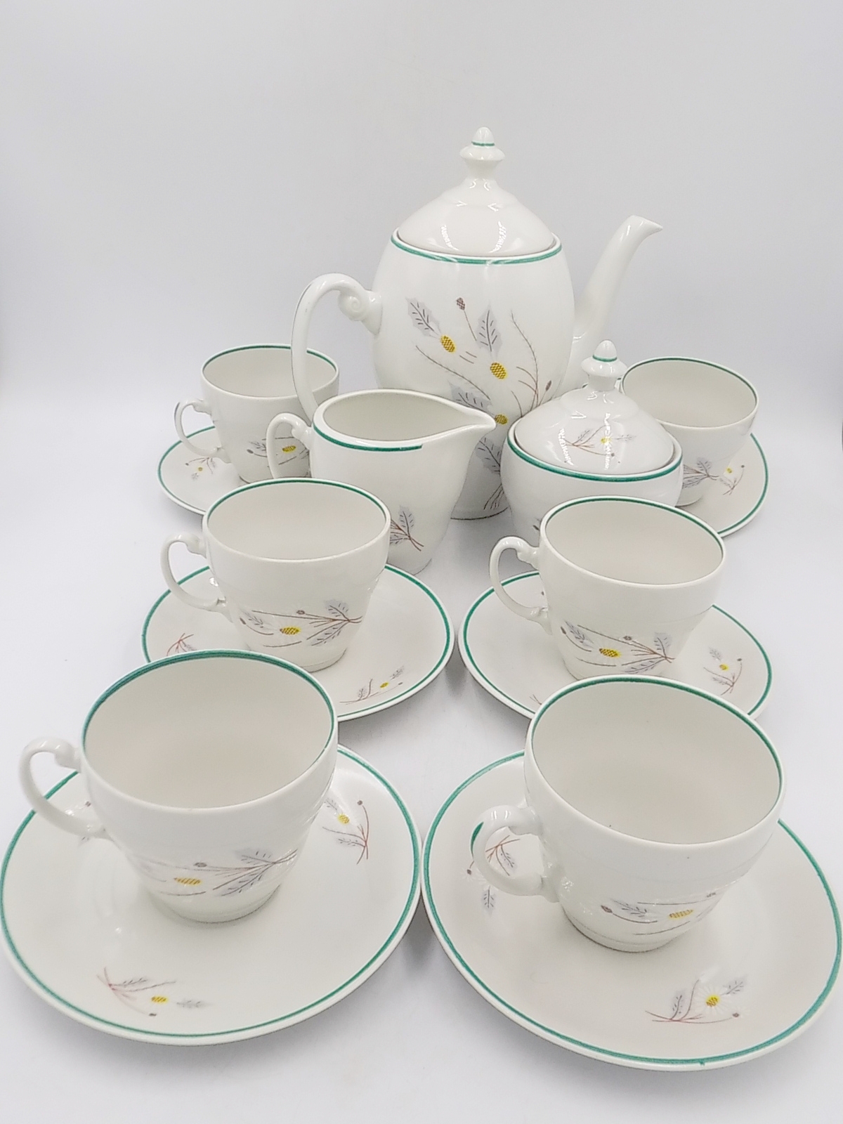 Porcelanowy serwis kawowy na 6 osób z Włocławka z II poł.XX w. Sygnowany. Wymiary; wys.7,3 x 8,5 cm, talerzyk 15 cm, dzbanek 22 cm, mlecznik 9 cm, cukiernica 12,5 cm.