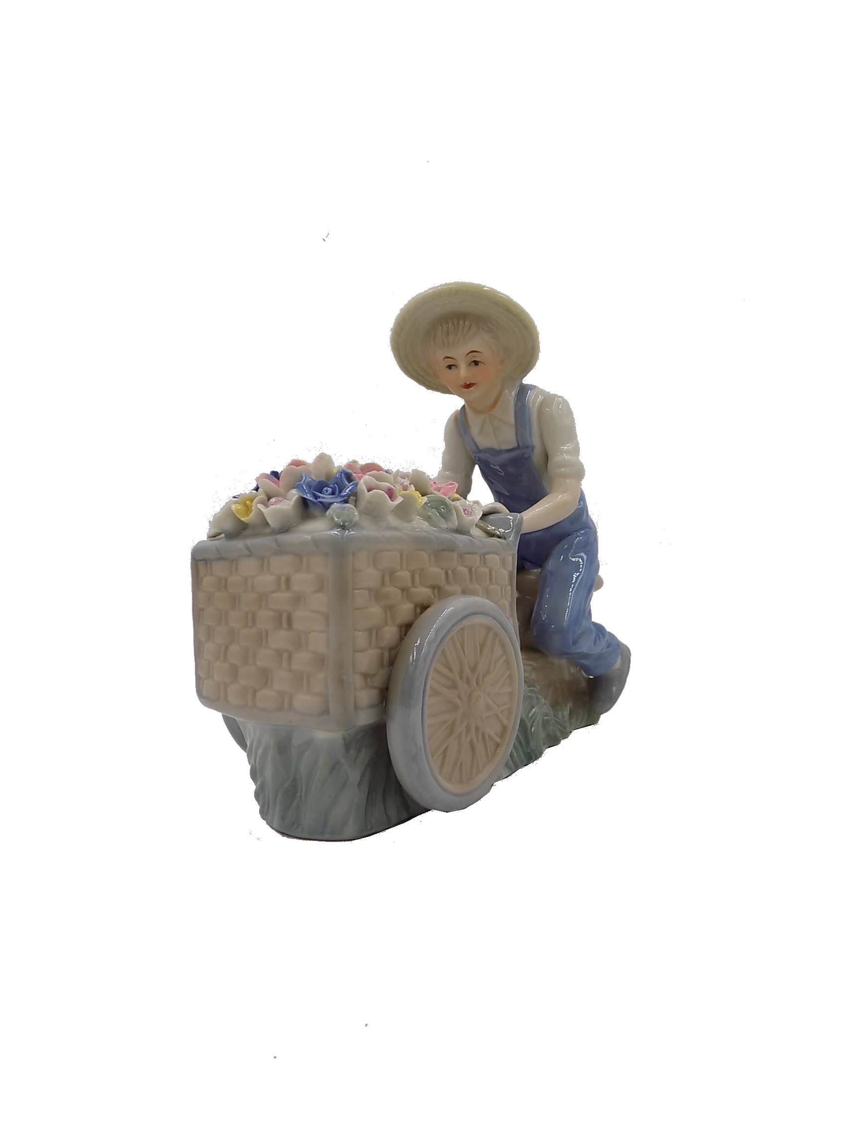Porcelanowa figura przedstawiająca chłopca na rowerze z koszem kwiatów. Figura prawdopodobnie z II poł.XX w. Wymiary; wys.18 x 19 x 8 cm.