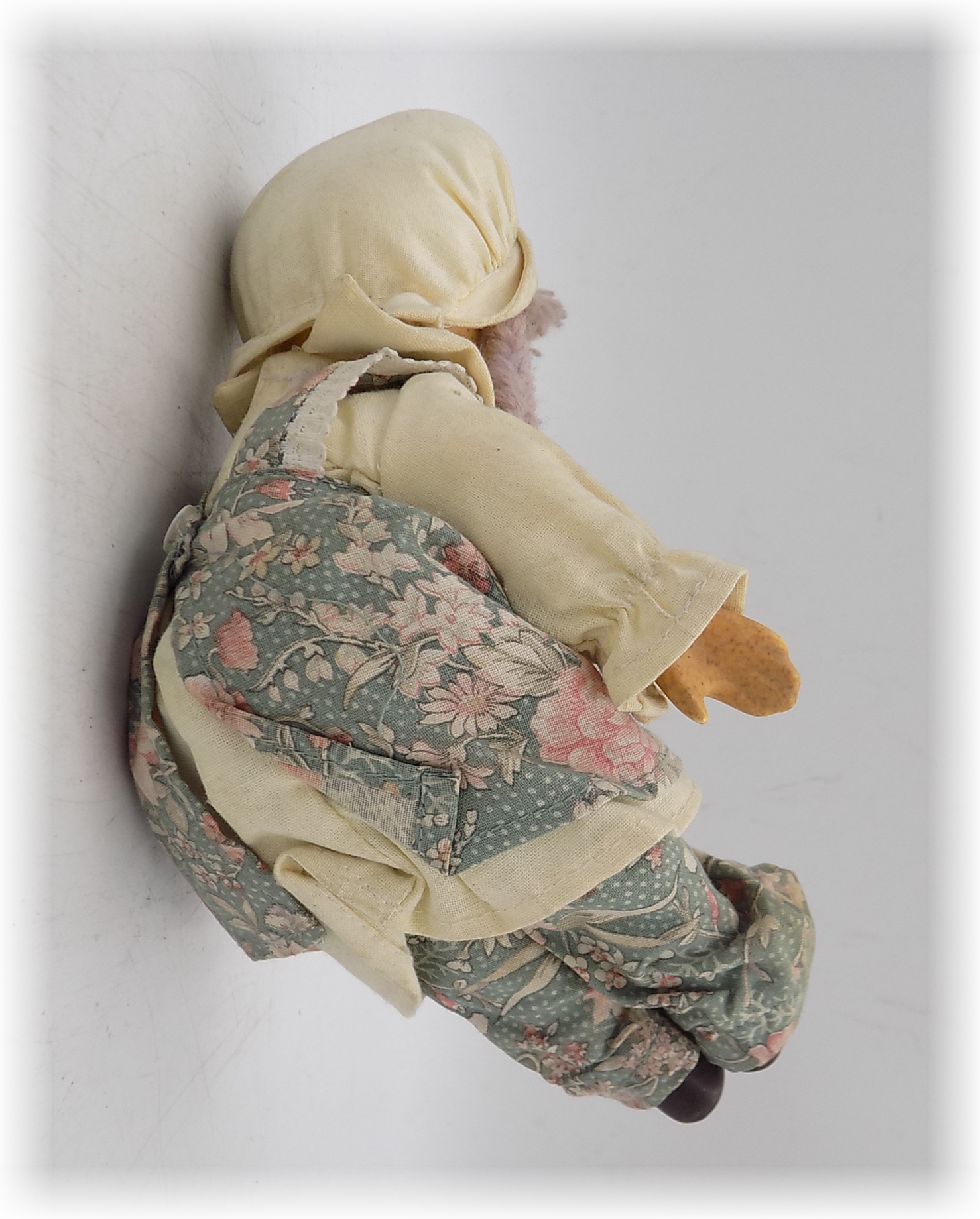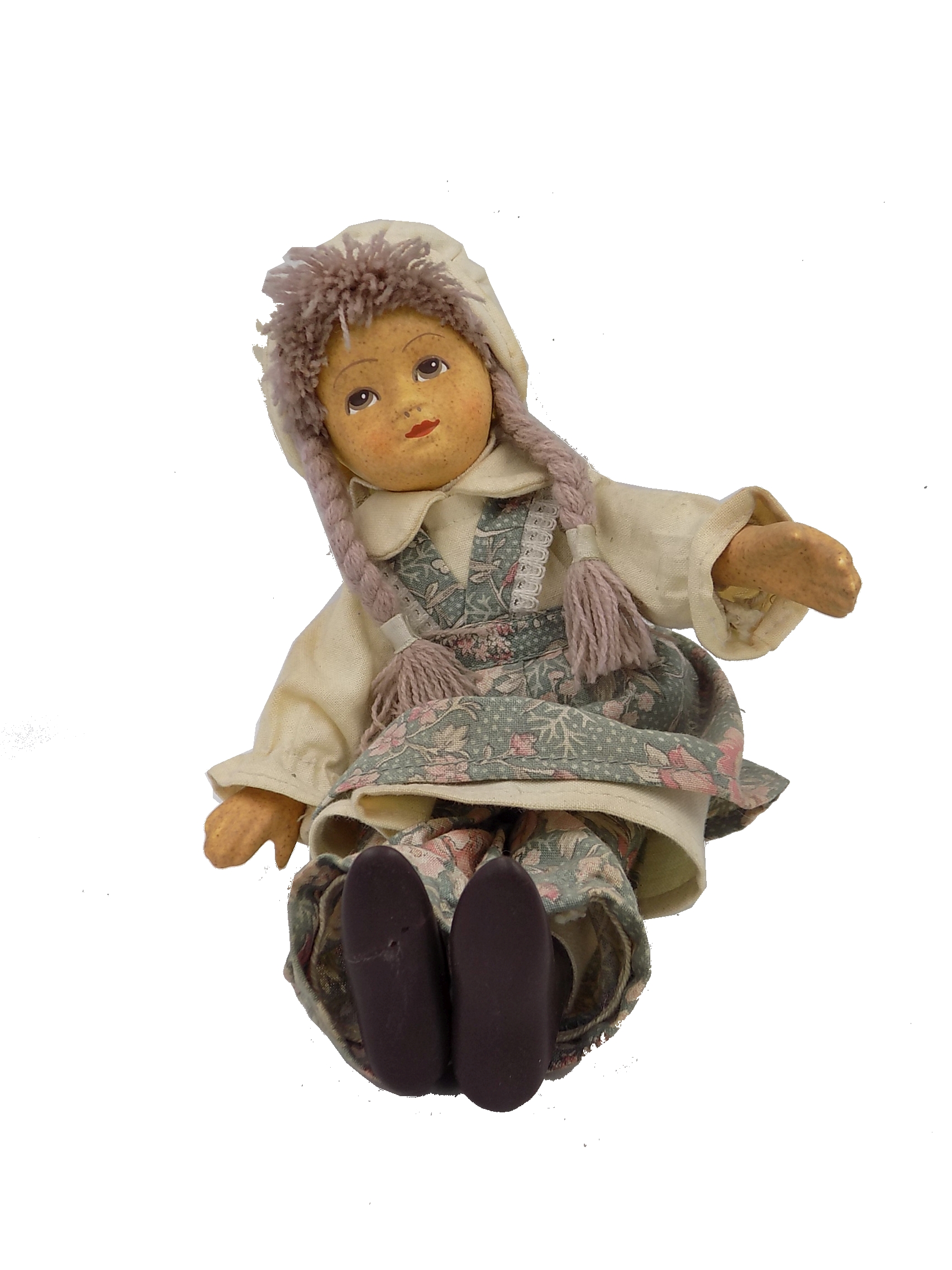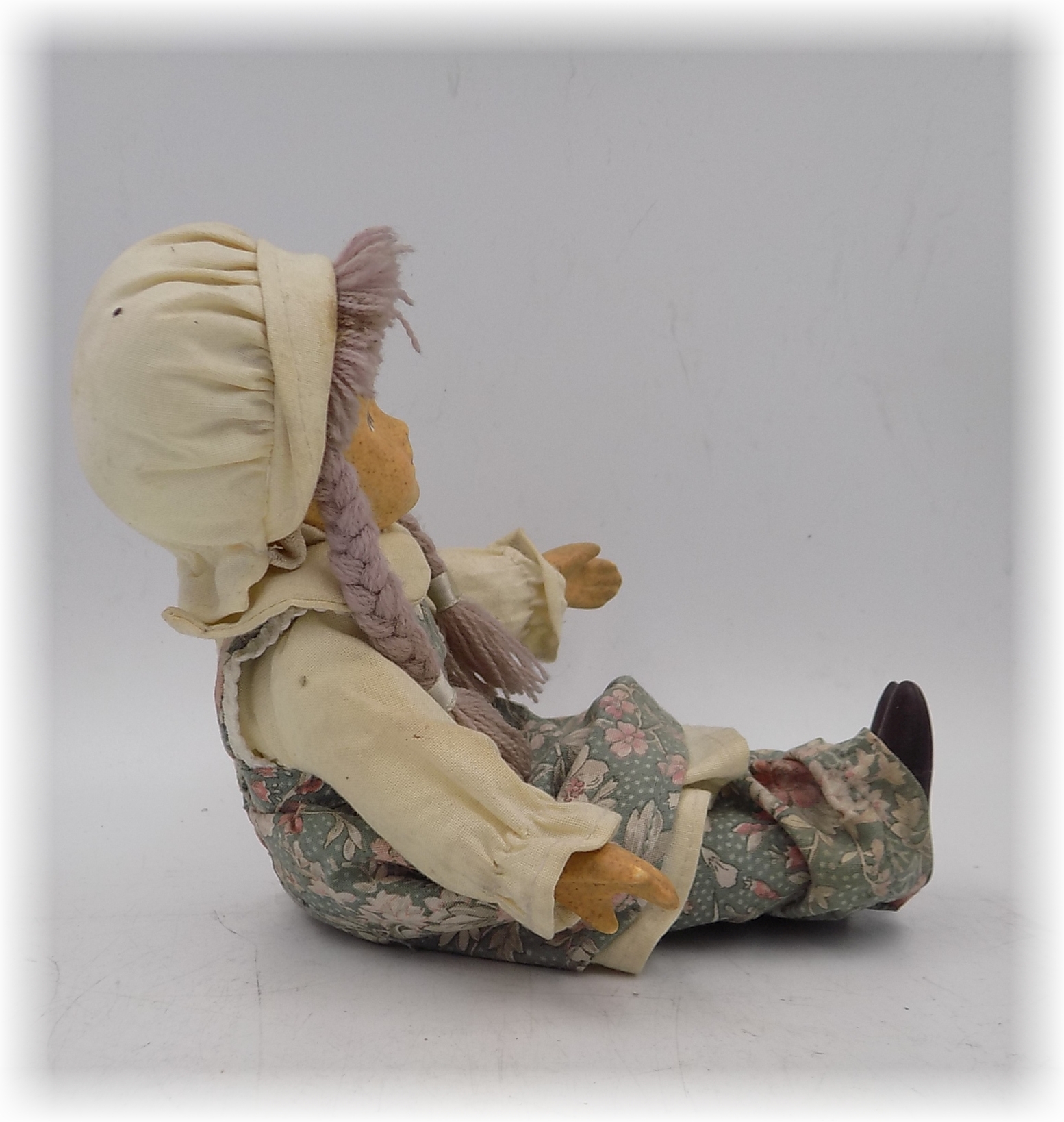 Lalka w pozycji siedzącej. Główka ceramiczna. Wymiary; wys. 13 x 15 x 13,5 cm