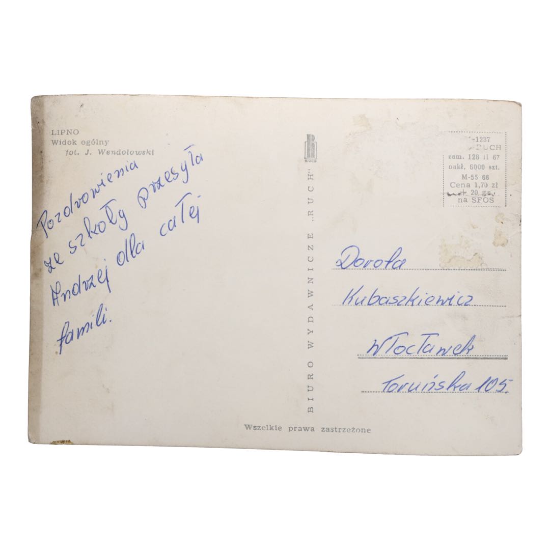 Lipno widok ogólny PRL". Ta wyjątkowa pocztówka o wymiarach 10,5 x 15 cm oferuje nie tylko klasyczną dekorację, ale także kawałek historii, idealny dla kolekcjonerów, miłośników retro i jako wyjątkowy prezent. Cena wynosi 25 zł.