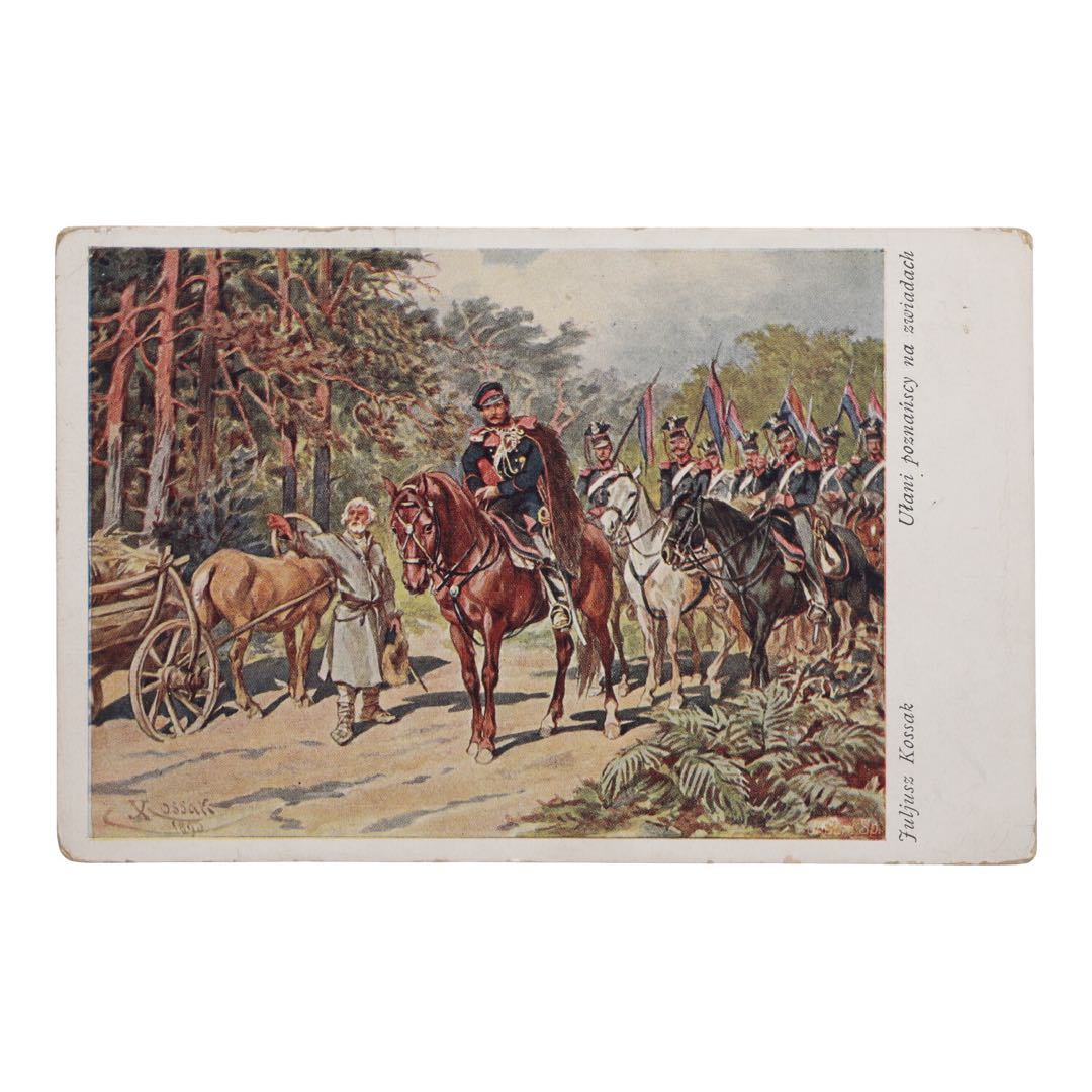 Juliusz Kossak, utalentowany malarz i ilustrator, znany jest z zamiłowania do przedstawiania scen z historii Polski, zwłaszcza tych z udziałem kawalerii. Oprócz walorów estetycznych, ta konkretna pocztówka służy jako portal do przeszłości, oferując unikalny wgląd w życie i obowiązki poznańskich ułanów.