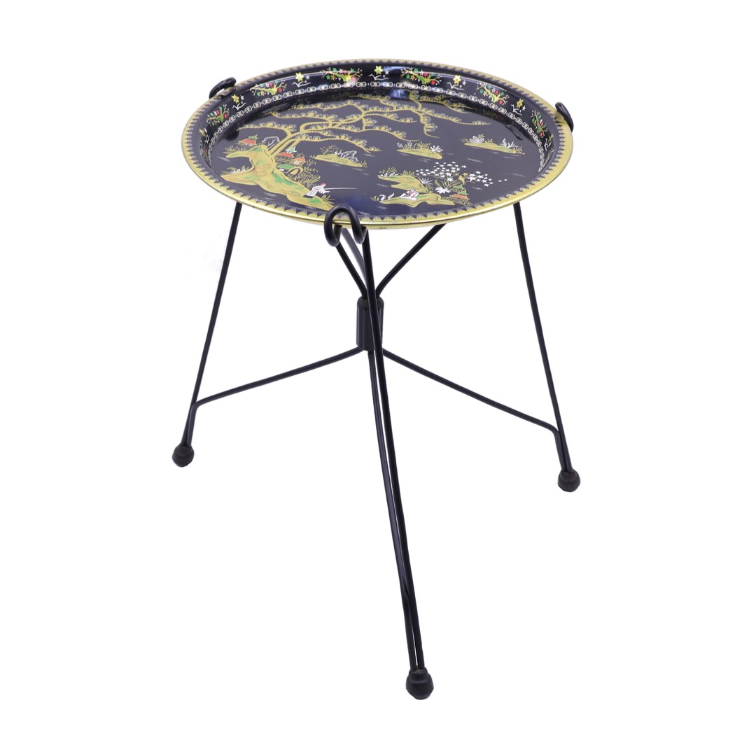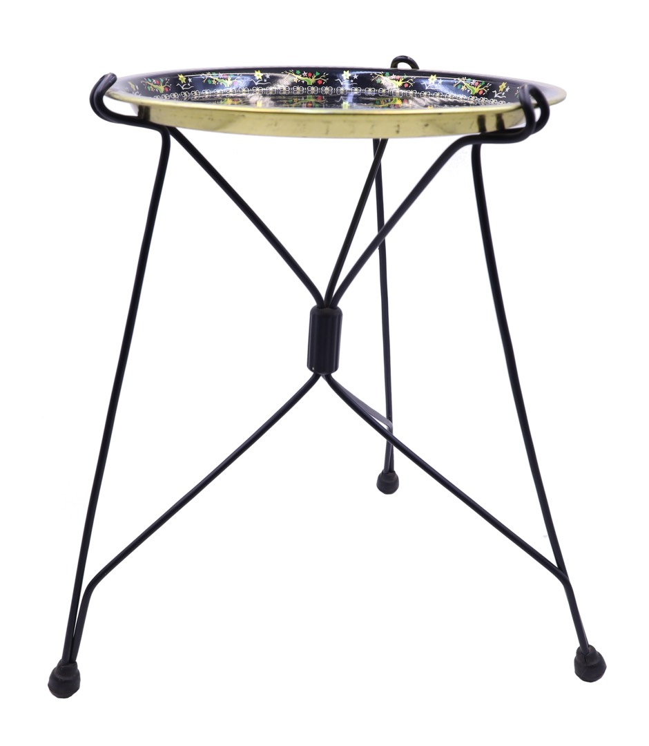 Blat stolika zachwyca wyjątkowym wykonaniem w formie litografowanej tacy. Metalowy charakter blatu, charakteryzujący się subtelnie podkreślonymi, szczegółowymi zdobieniami, nadaje temu meblowi wyjątkowego charakteru. Oryginalne wzory litografii nawiązują do estetyki epoki PRL, tworząc harmonijną opowieść między historią a funkcjonalnością.
