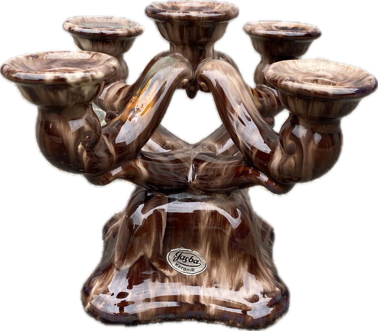 Ceramiczny świecznik na 5 świec cudownie glazurowany w stylu Art. Deco. Pochodzi Prawdopodobnie z lat 60-tych. Sygnowany. Oryginalna etykieta. Wymiary; wys.18 x 23 x 18 cm.