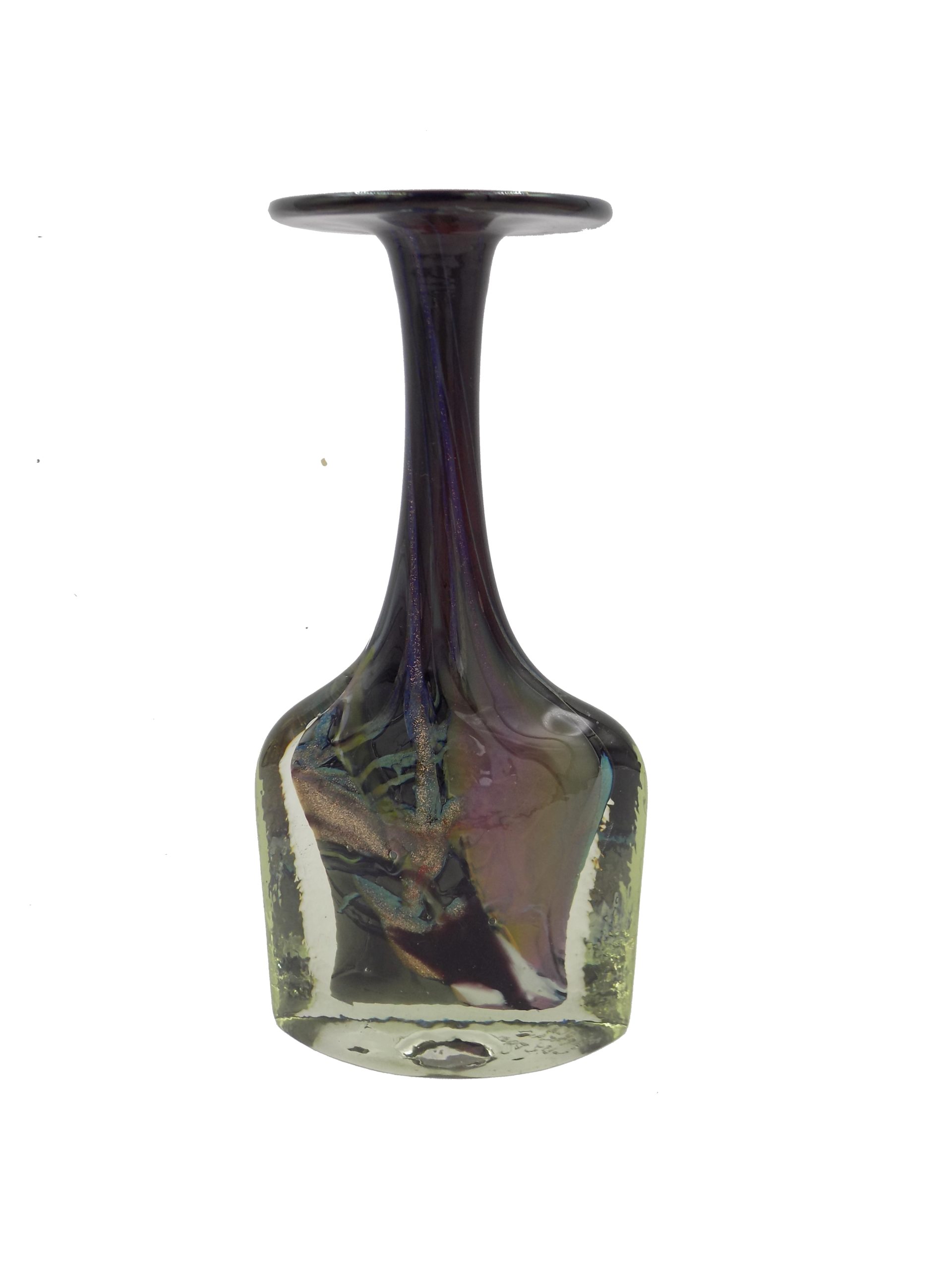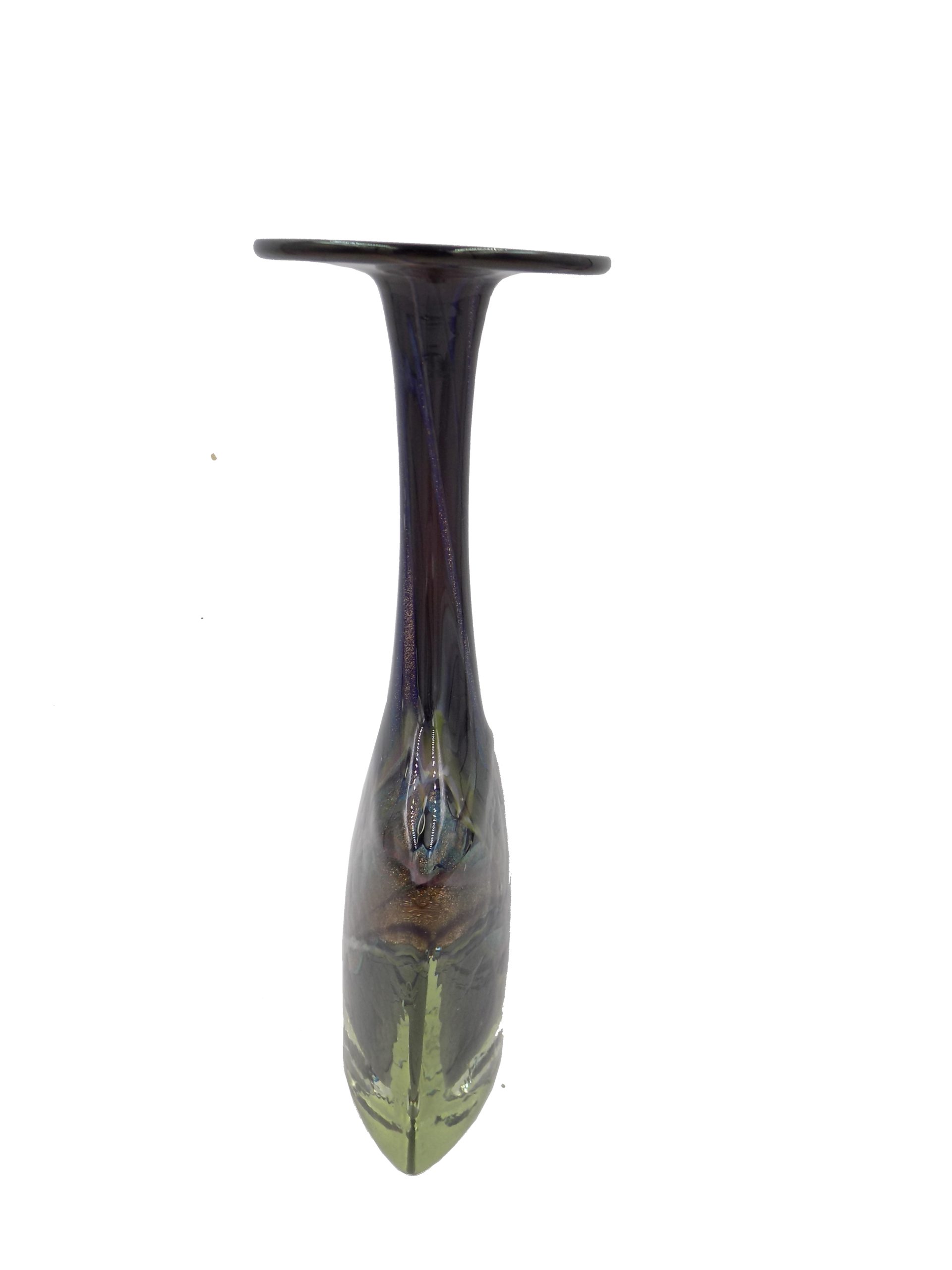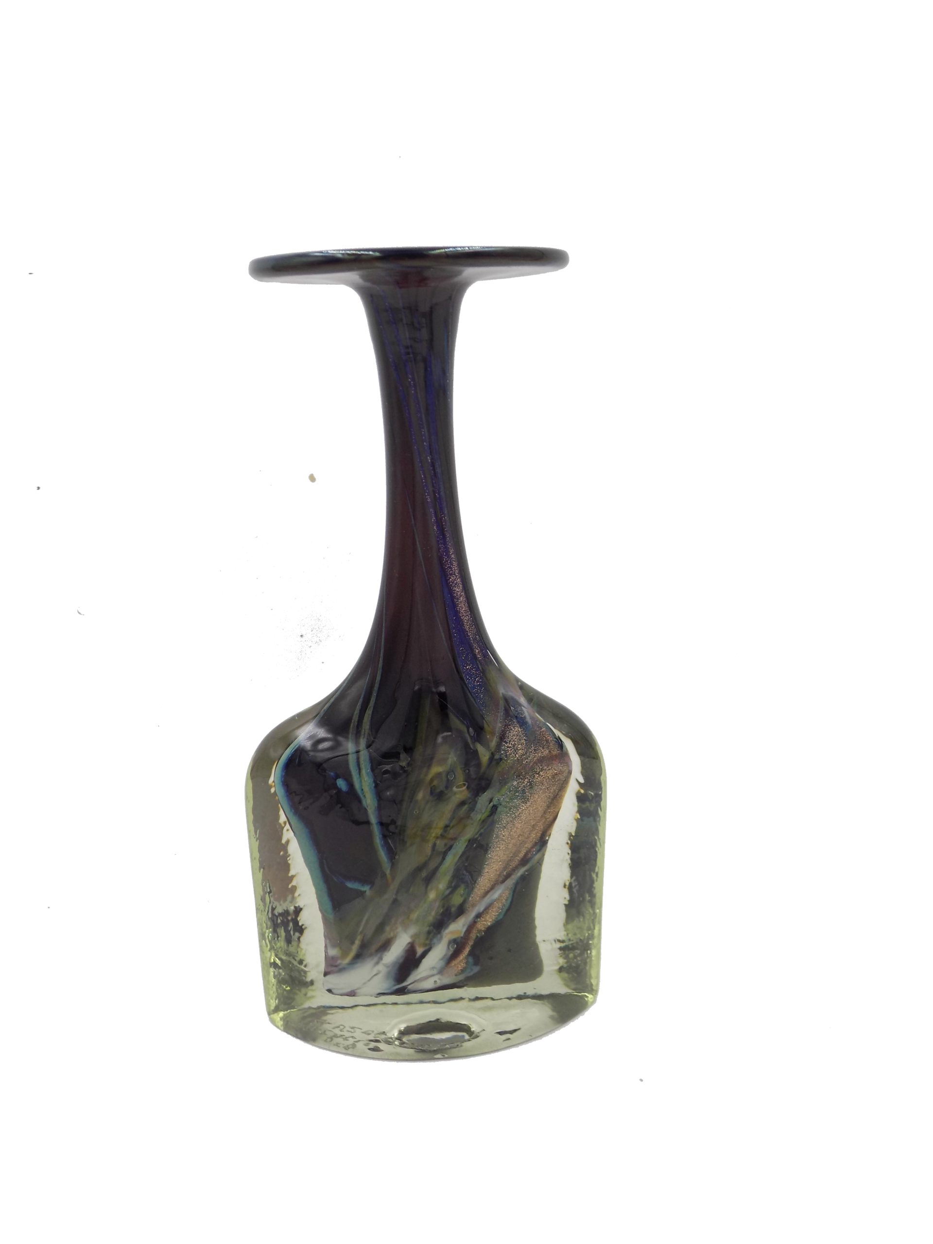 Szkło artystyczne (wazon na jeden kwiat) znanego i cenionego projektanta szkła Michele Novaro z Biot we Francji. Tworzy z miłości do szkła. Praca sygnowana. Pochodzi prawdopodobnie z lat 80-tych. Wymiary; wys.22 x 8 x 10 cm.