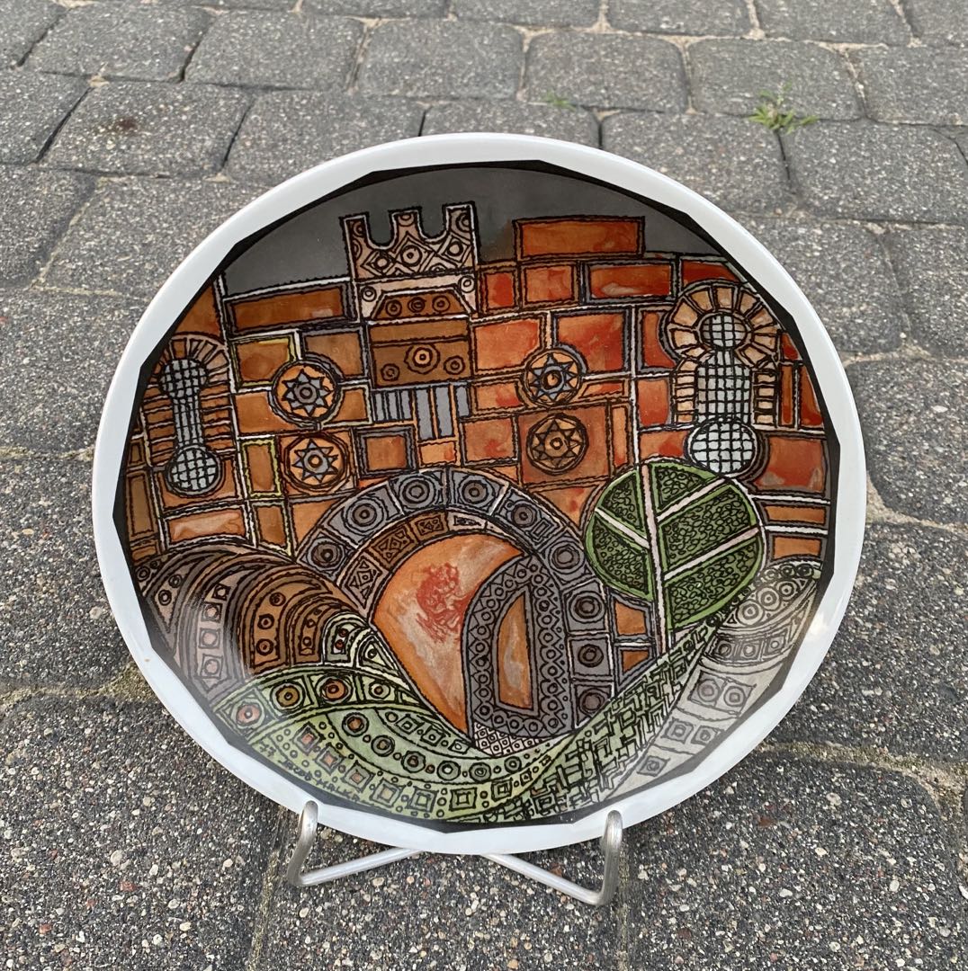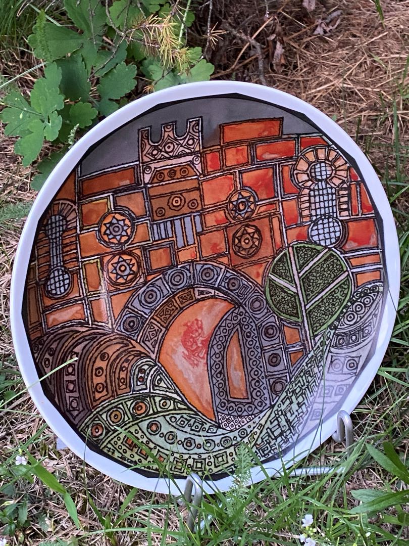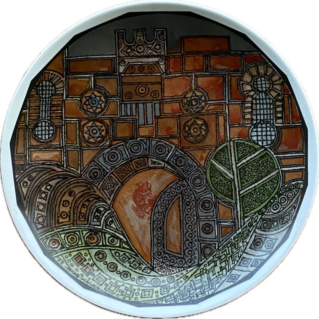 Porcelanowy talerz dekoracyjny izraelskiego artysty Jacob Malca z serii „My Jerusalem” prawdopodobnie z II poł. XX w. Wymiary; 2,5 x 23 cm.