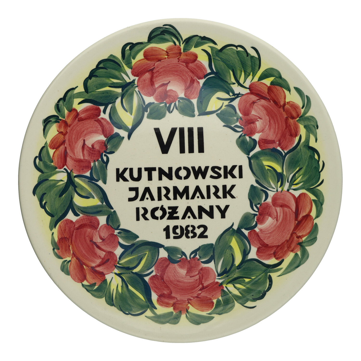 Fajansowy talerz okolicznościowy z ZF Koło, upamiętniający VIII Kutnowski Jarmark Różany, który odbył się w 1982 r. Sygnowany. Ręcznie malowany. Wymiary; 24 cm. /O.