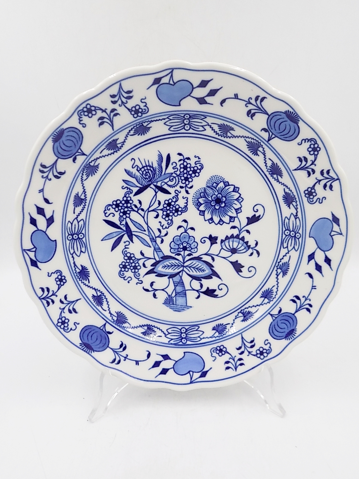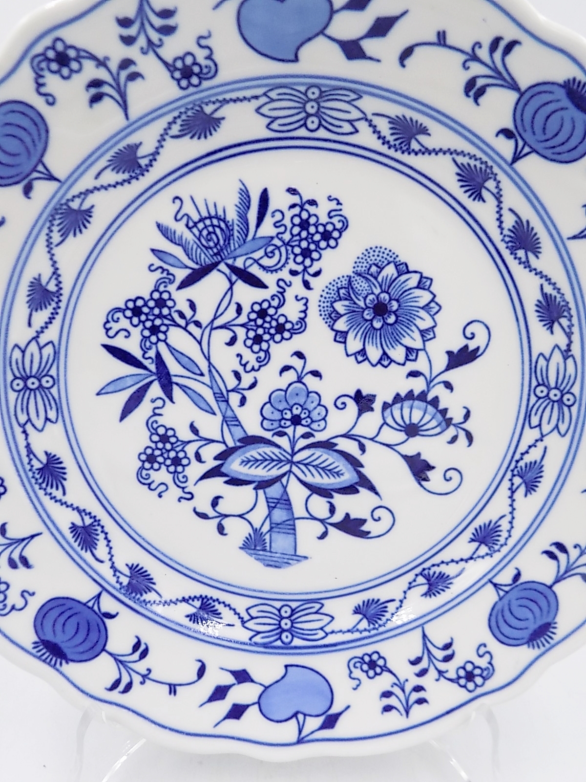 Porcelanowy talerz z Meissen z fabr. Wzór cebulowy. Wymiary; 24,5 cmyki C. Teichert. Sygnatura z lat 1882 - 1929