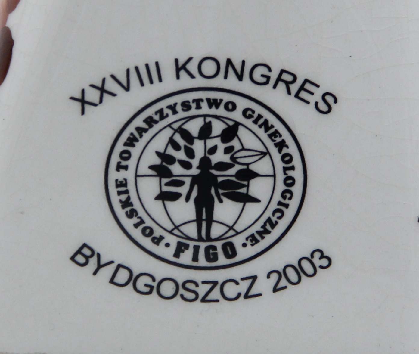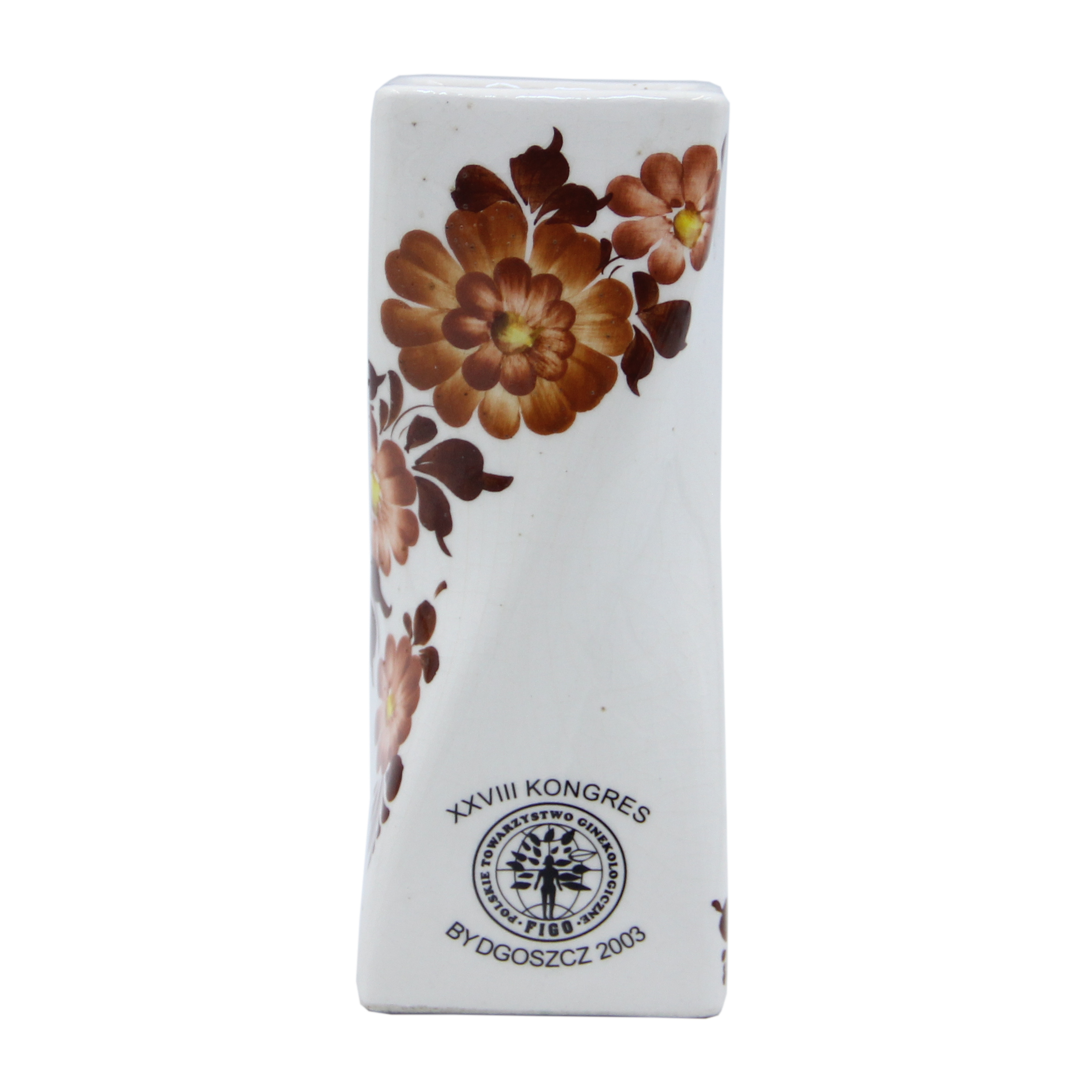Fajansowy wazon z Włocławka, wyprodukowany z okazji XXVIII Kongresu Polskiego Towarzystwa Ginekologicznego FIGO w Bydgoszczy w 2003 roku. Sygnowany. Ręcznie malowany przez D. Paszkiewicz.