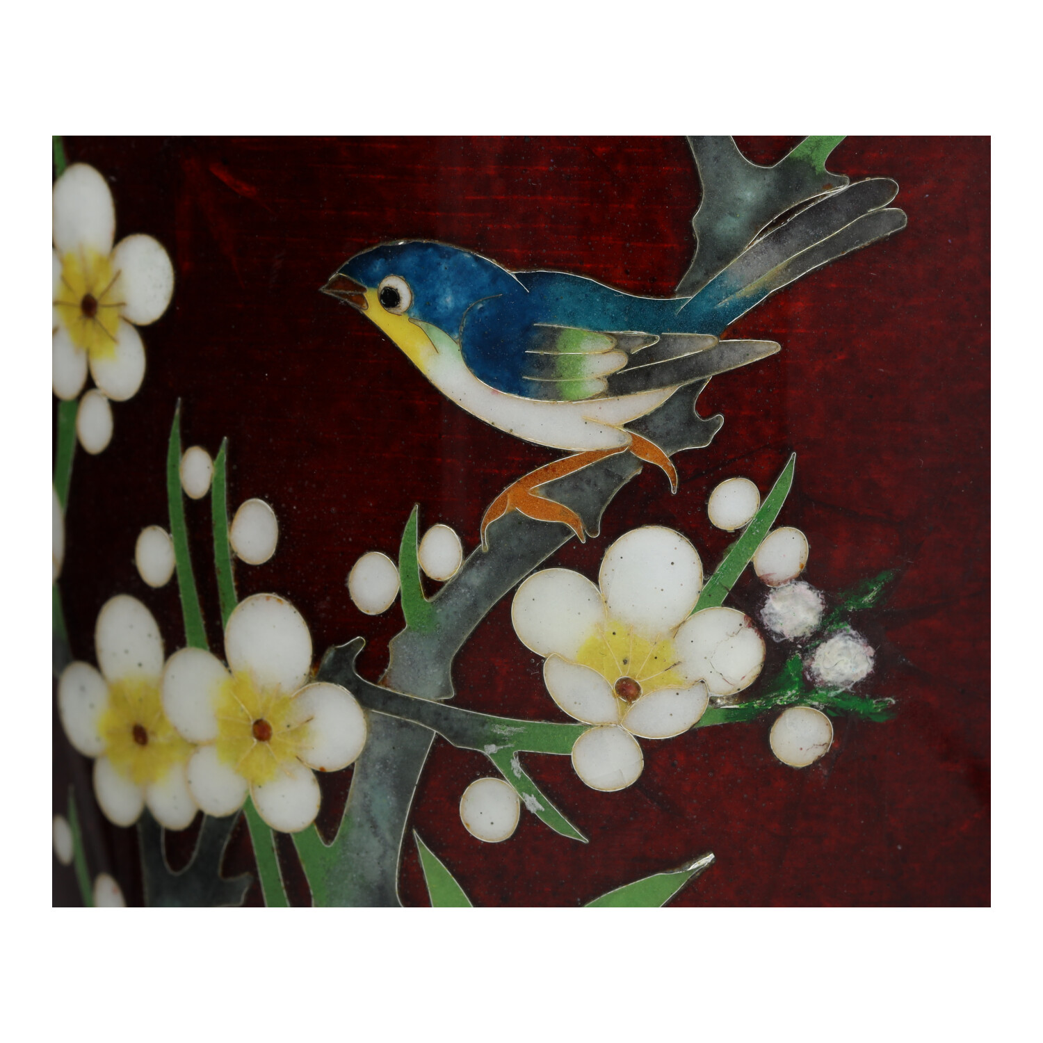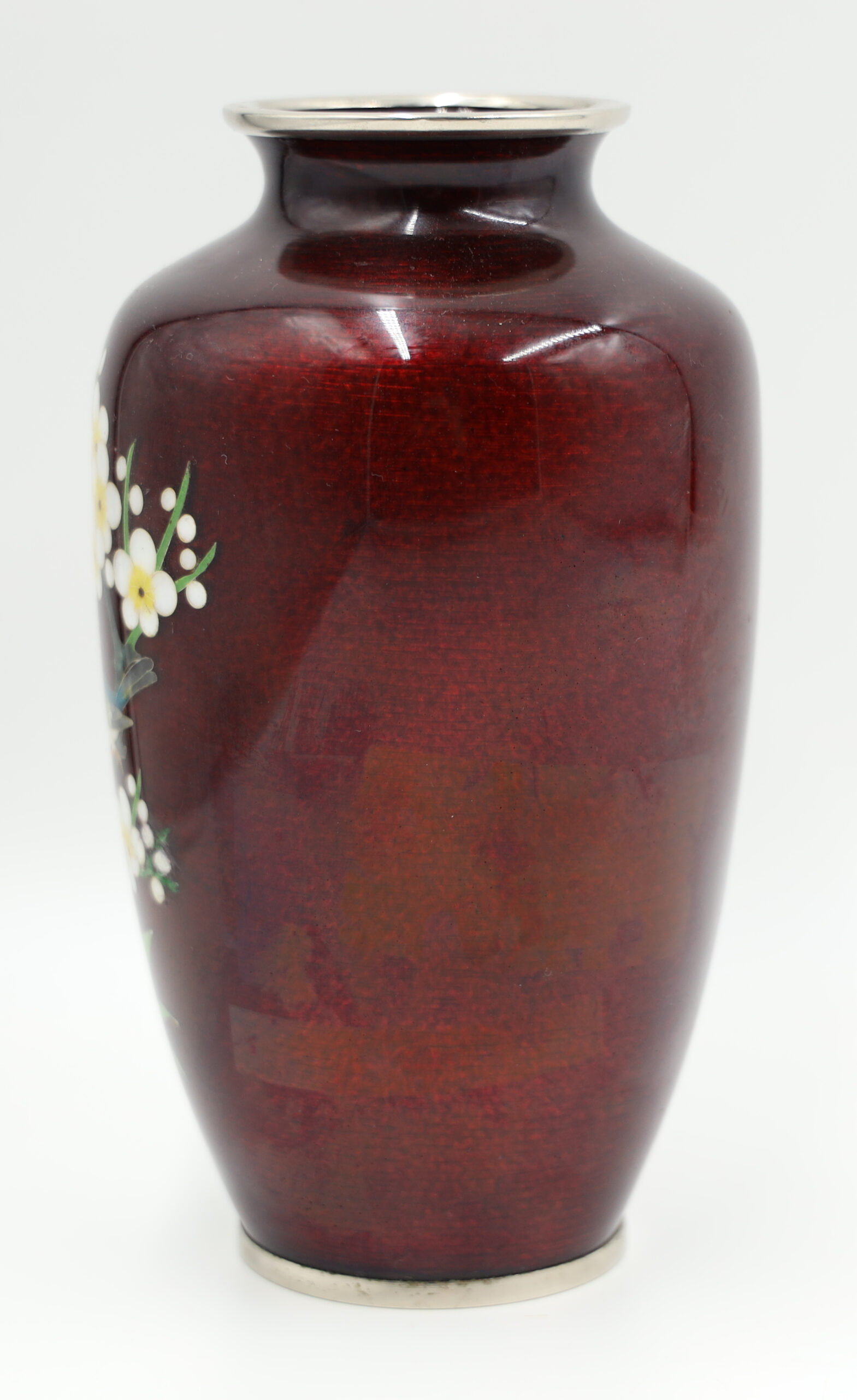 Rzemieślnik, który ozdobił ten wazon Ando, użył technik basse-taille i cloisonné do oszałamiającego efektu. Jak widać na załączonych zdjęciach, wazon ma jajowatą formę która została wykończona w rubinowym czerwonym kolorze znanym jako krew gołębia lub akasuke. Metoda Cloisonné jest to technika wypełniania różnokolorową emalią „komórek” powstałych na powierzchni zdobionego przedmiotu za pomocą przylutowanych cienkich blaszek lub drucików. Stopa i warga wazonu są obramowane niklowo-srebrnymi paskami. Wazon jest po renowacji. Należy również zauważyć, że pod szkliwem znajduje się pajęczynka powstała po uderzeniu pokazana na zdjęciu, która jest szorstka w dotyku,Wymiary; wys. 18 x 9 cm. Ten elegancki wazon pięknie się wyświetla i świetnie wygląda samodzielnie lub trzymając kompozycję kwiatową. Wspaniałe zabytkowe znalezisko z pewnością będzie dekoracyjnym punktem centralnym, gdziekolwiek się znajdzie.
