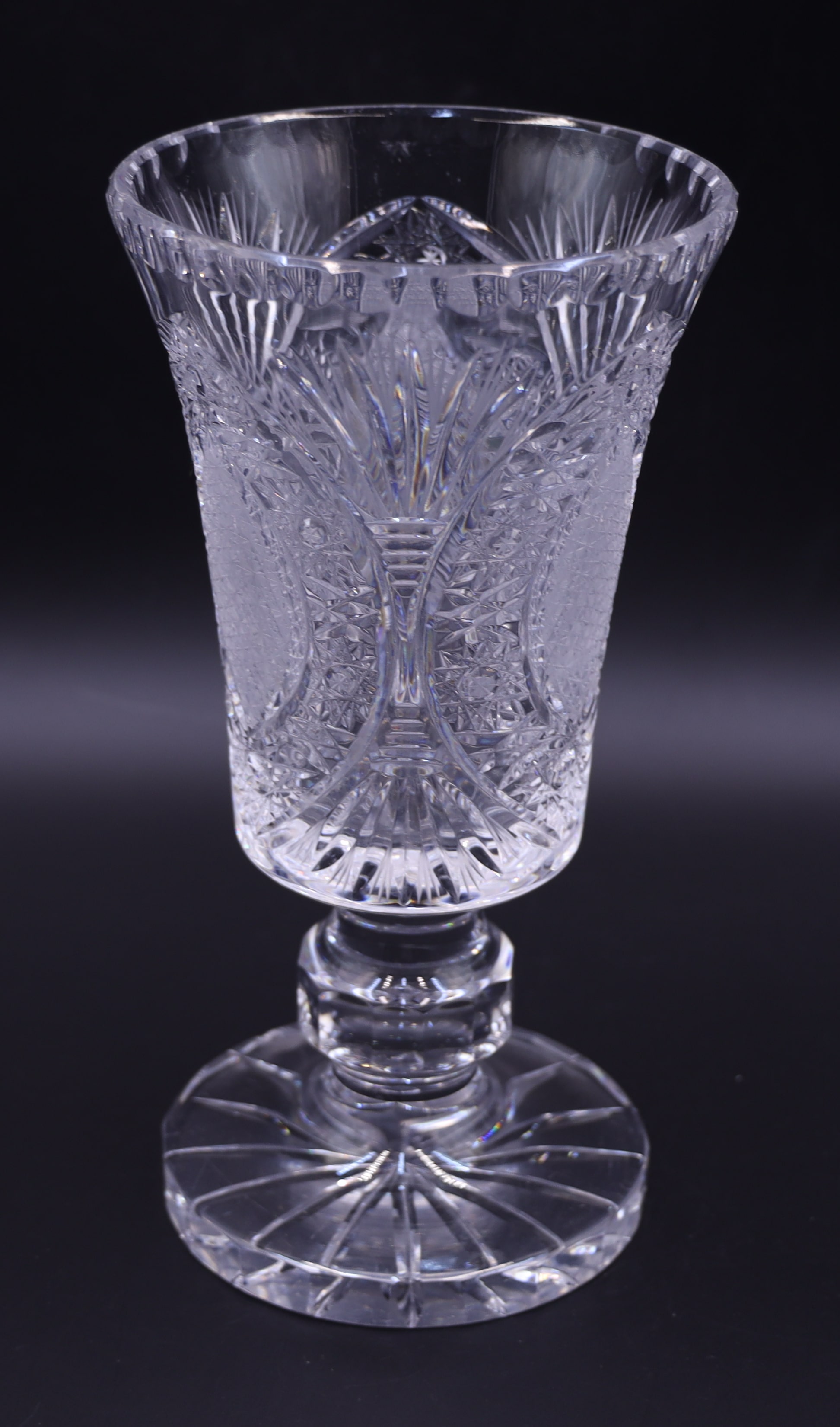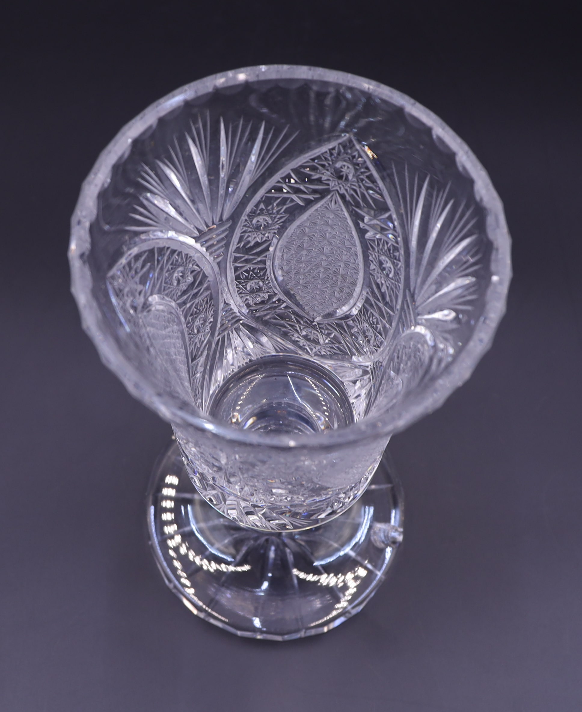 Kryształowy wazon wyróżnia się imponującym szlifem, który dodaje mu blasku i elegancji. Każdy detal tego dzieła sztuki został starannie wykonany, aby podkreślić jego unikalne cechy. Jego wymiary to 25,5 cm wysokości i 13,5 cm średnicy, co sprawia, że jest zarówno atrakcyjnym, jak i użytecznym elementem dekoracji.
