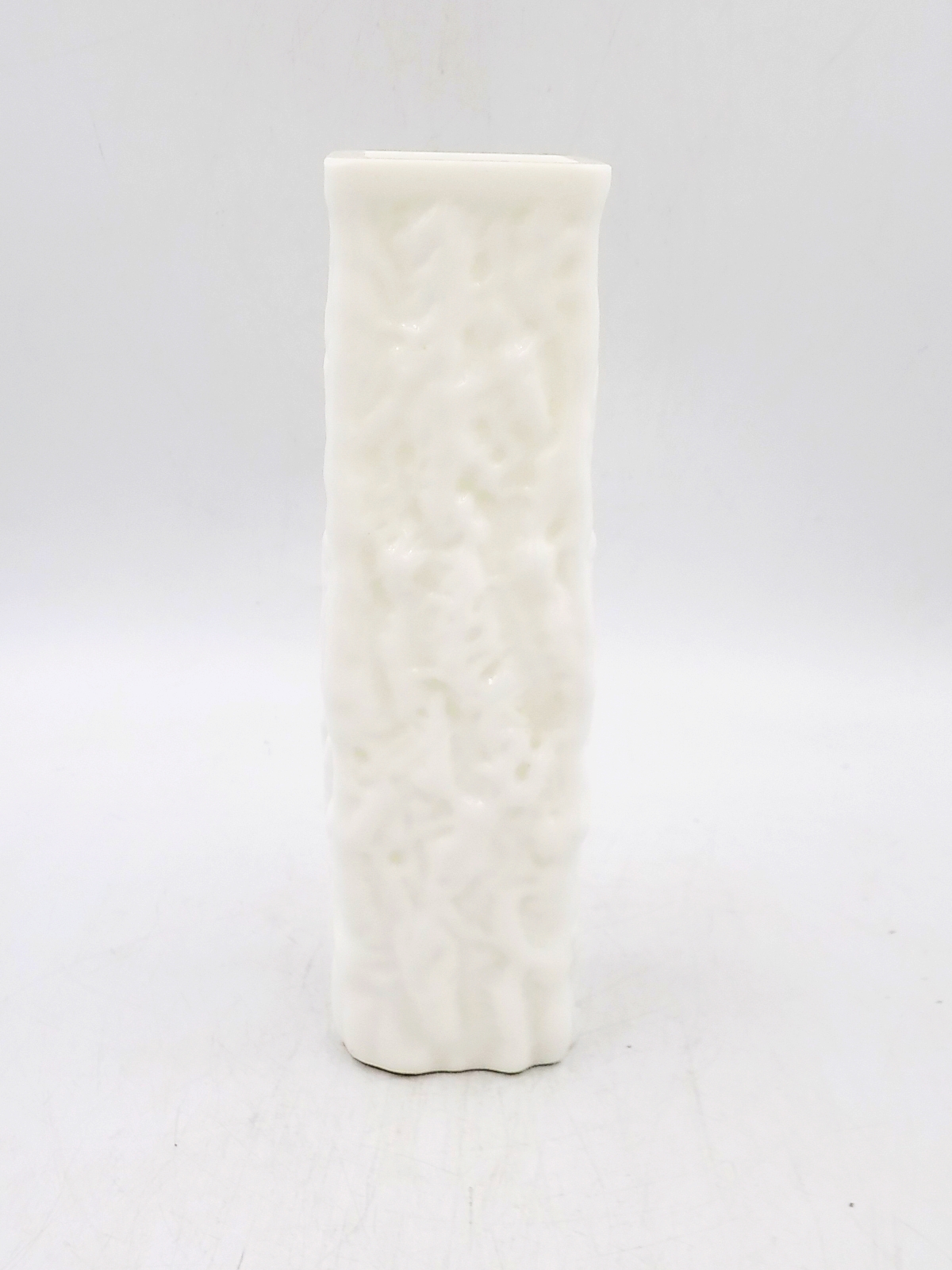 Wazon z mlecznego szkła prasowanego o lodowej strukturze. Pochodzi prawdopodobnie z Huty Ingrid Glass z II poł.XX w. Wymiary; 20,5 x 6 x 6 cm.