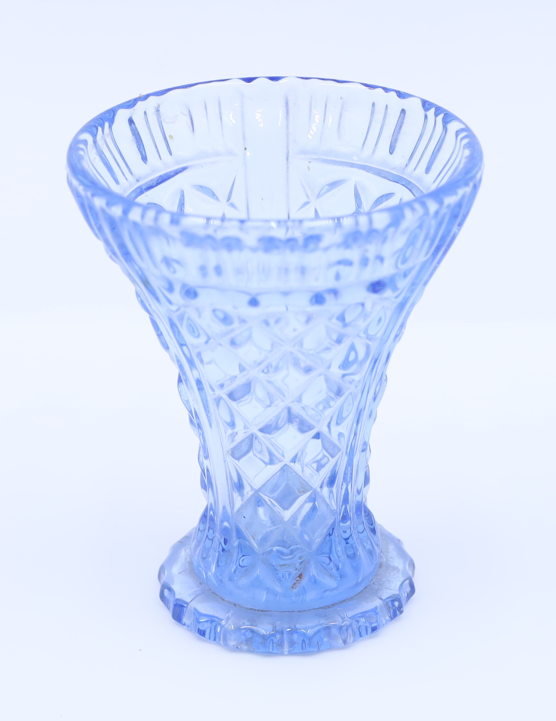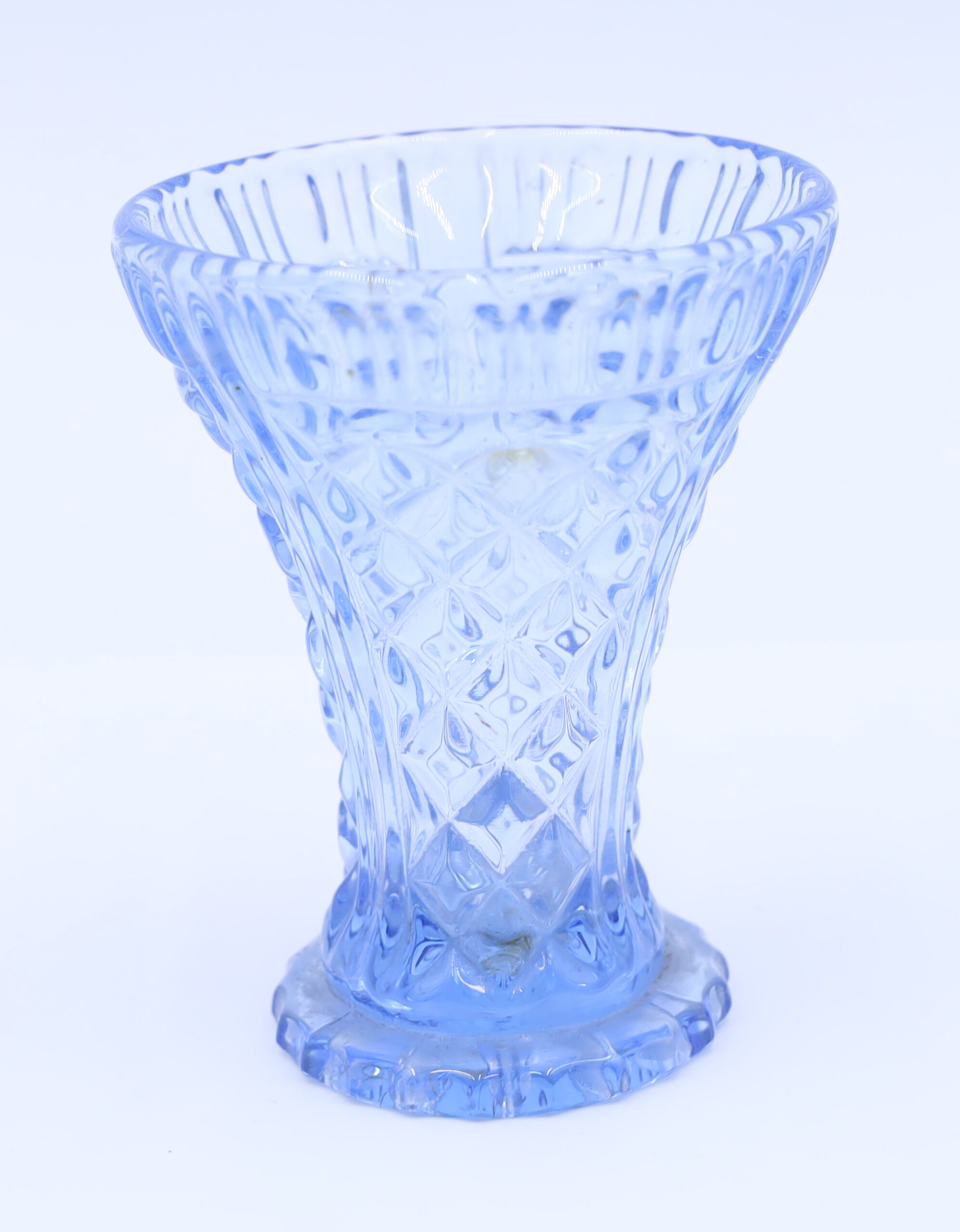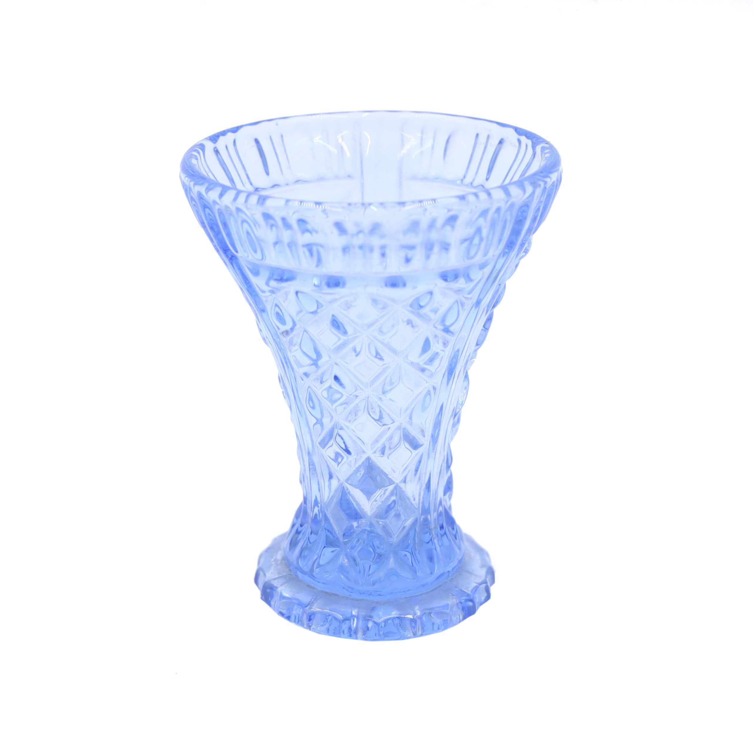 Wazonik z Huty Szkła Ząbkowice. Wykonany ze szkła prasowanego, barwionego w masie na kolor niebieski. Wzór nr 2065.