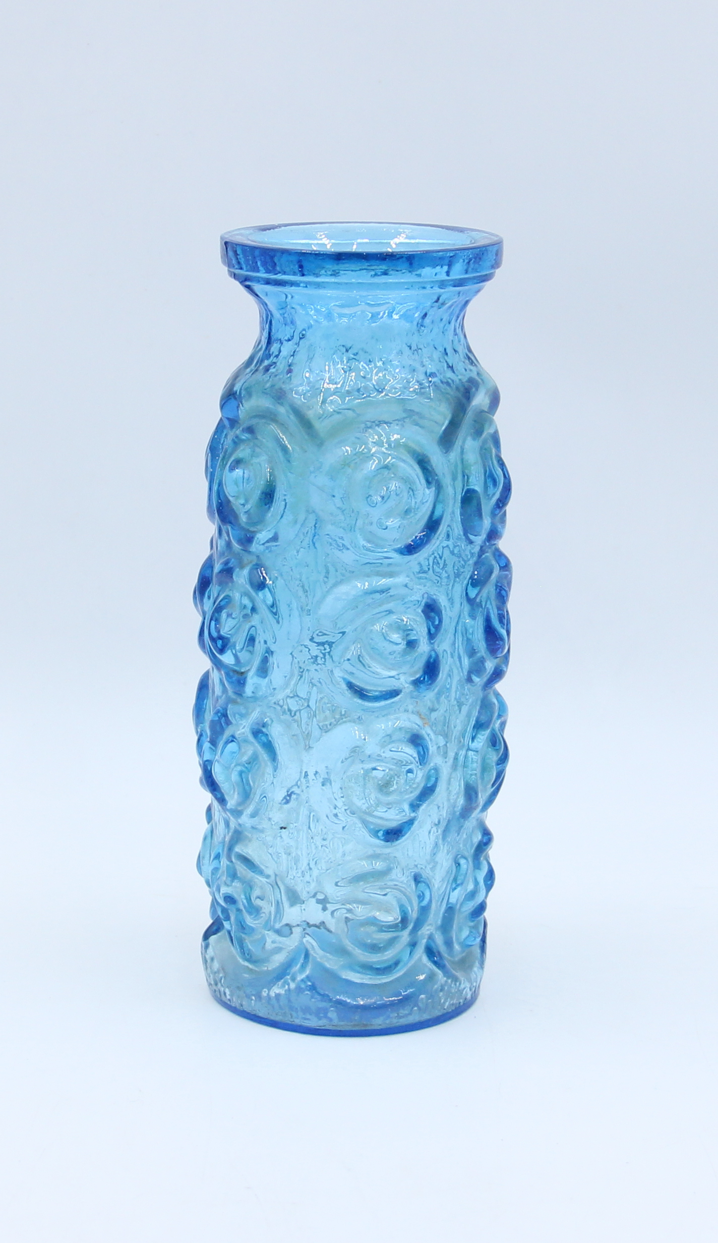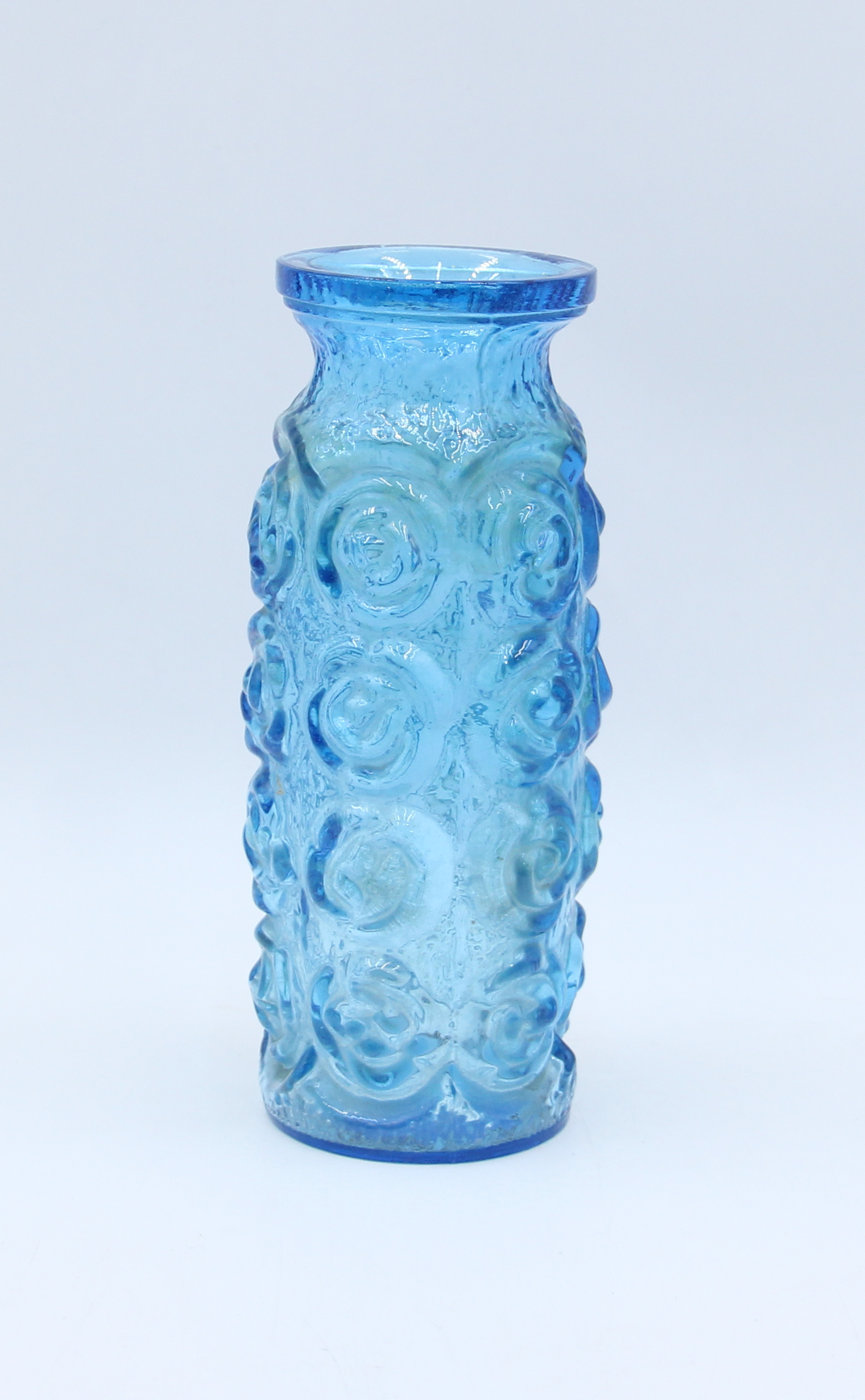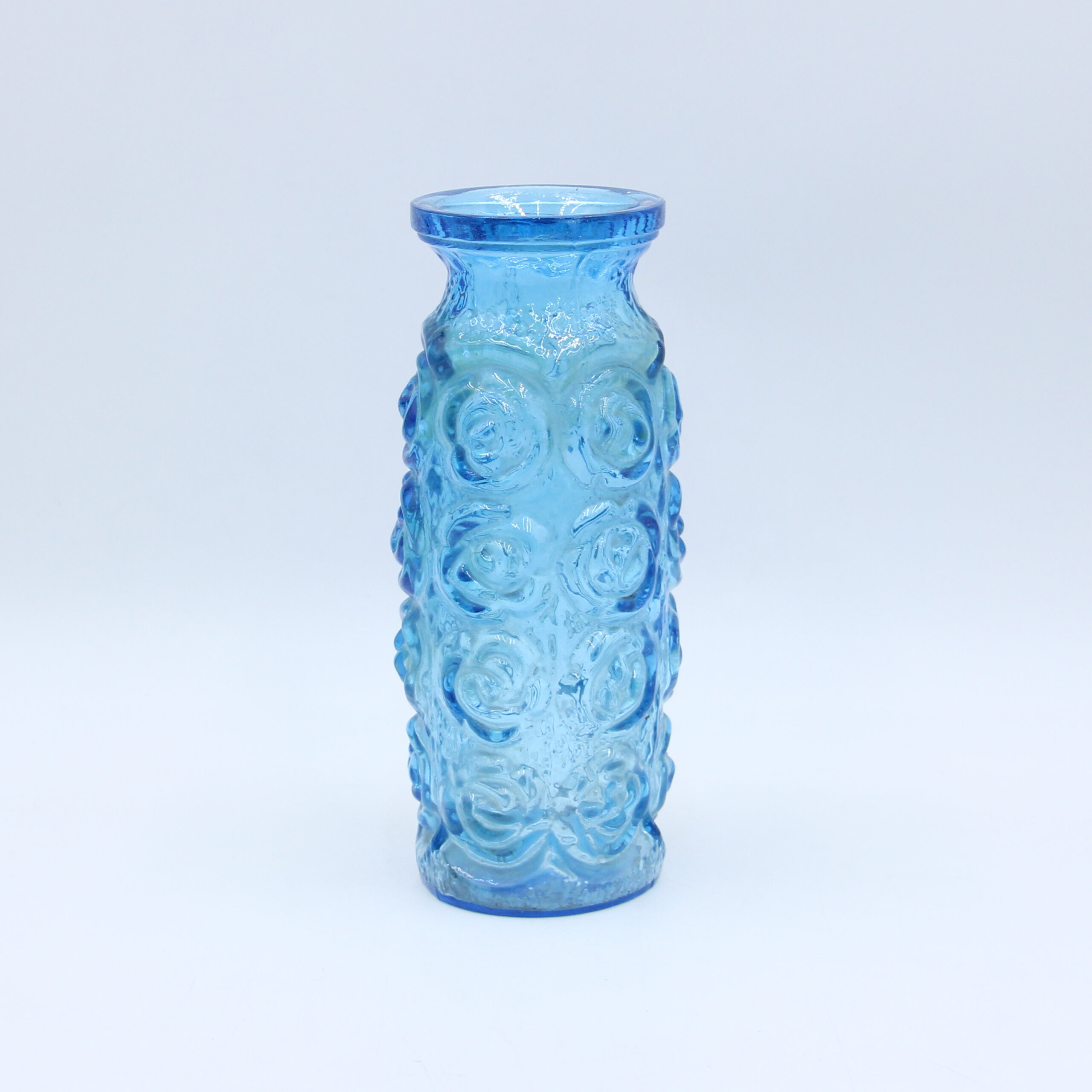 Niebieski wazon Róże z Huty Szkła Laura w Tarnowie z lat 70/80-tych. Szkło prasowane barwione w masie.