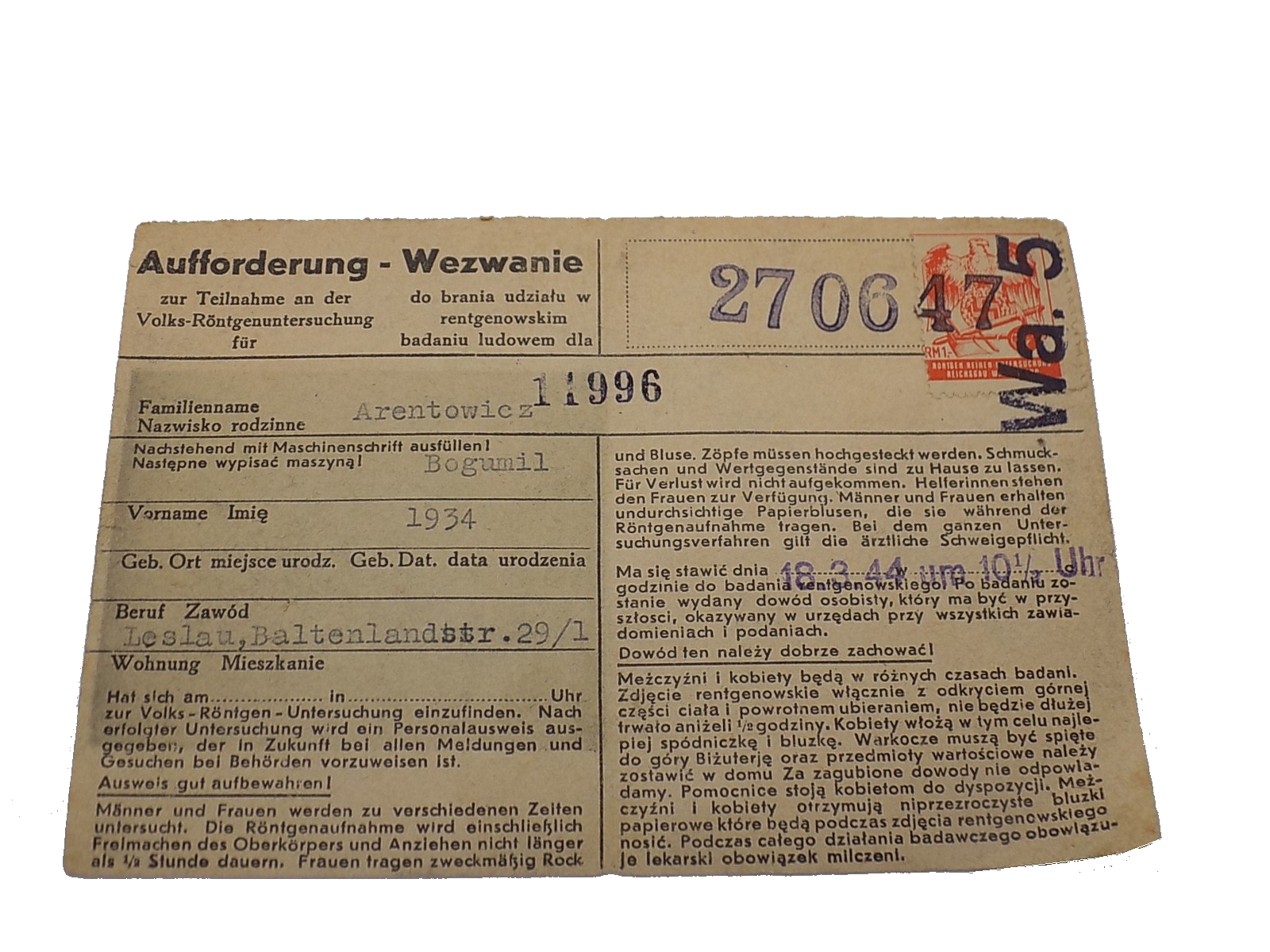 Wezwanie na badanie rentgenowskie z 1944 roku. Wymiary; 14,5 x 10 cm