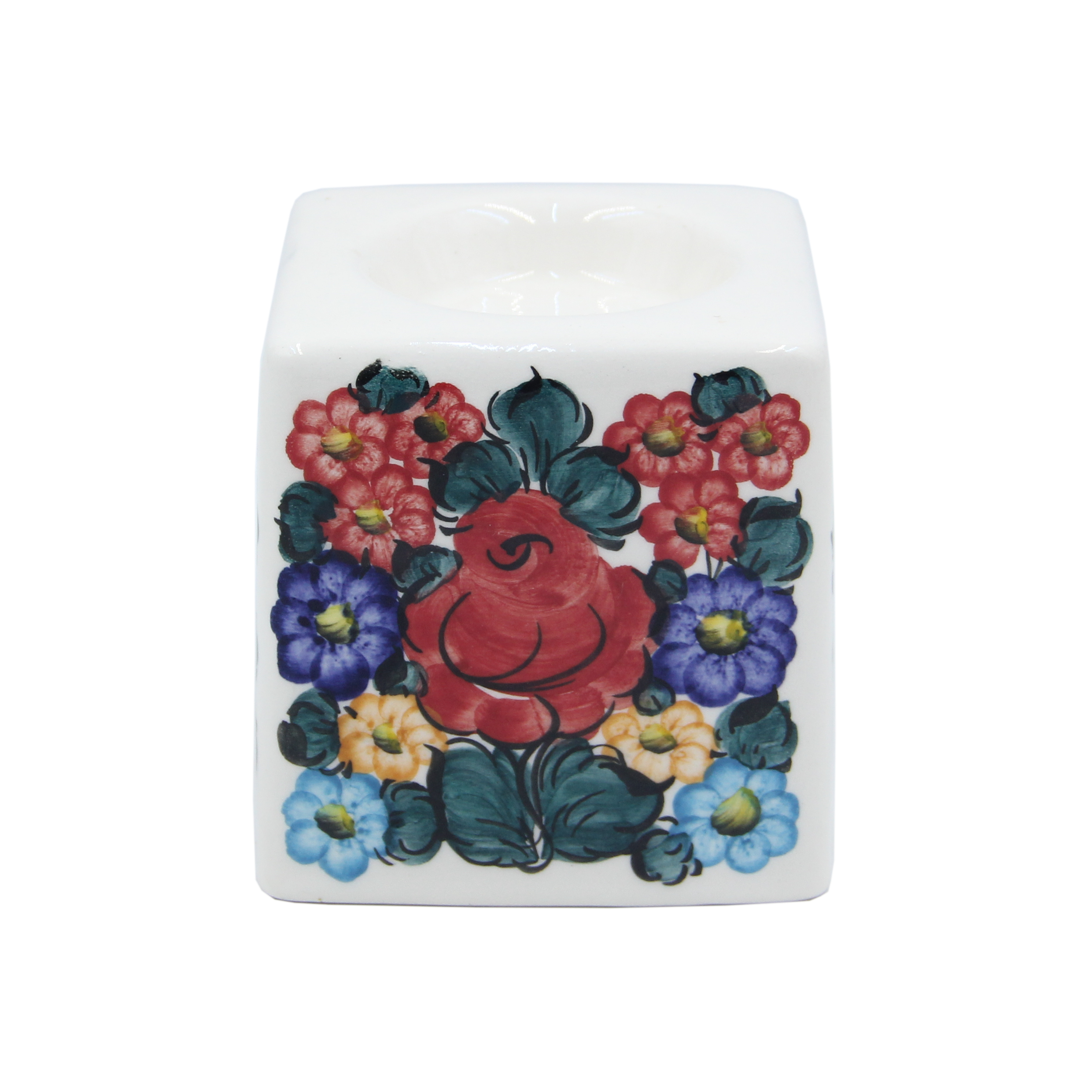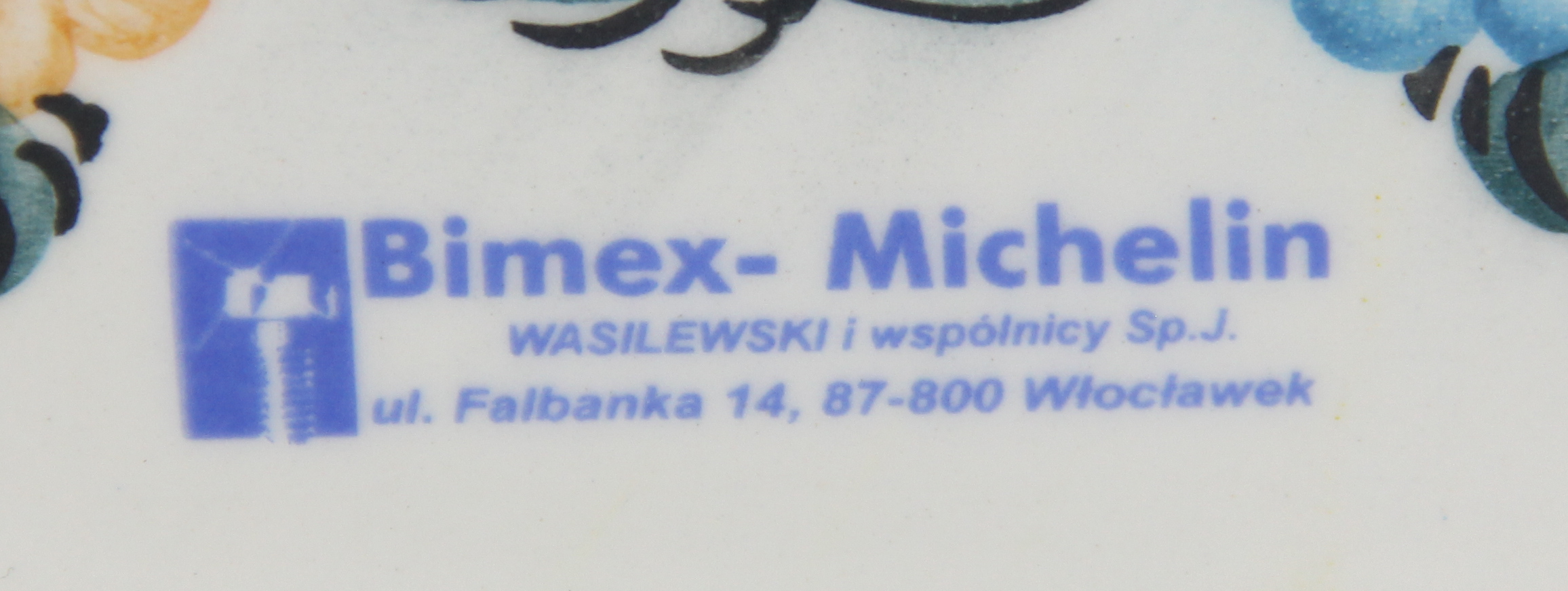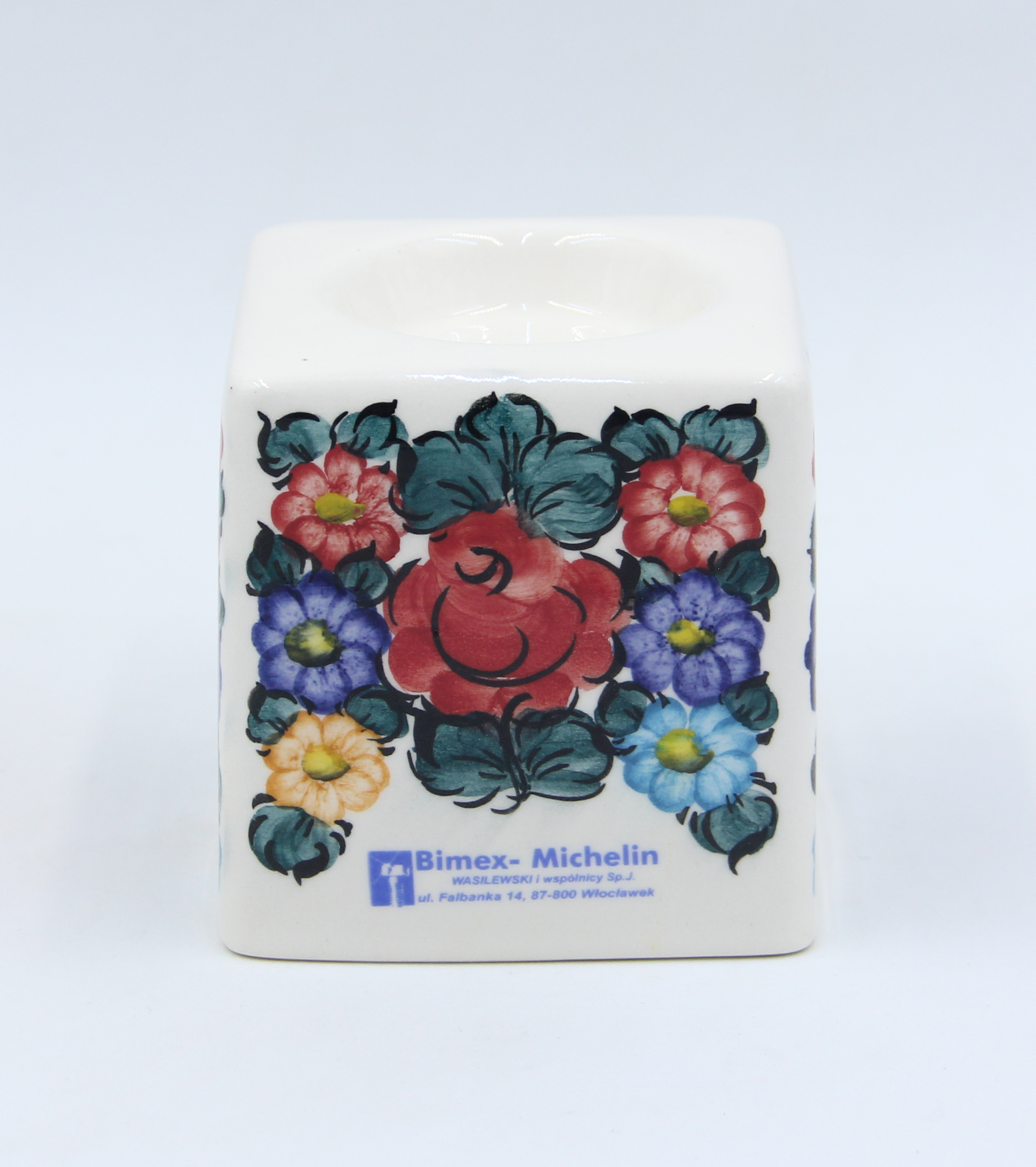Fajansowy świecznik z Włocławka, wykonany dla firmy Bimex – Michelin z Włocławka. Sygnowany. Ręcznie malowany przez M. Madzierską.