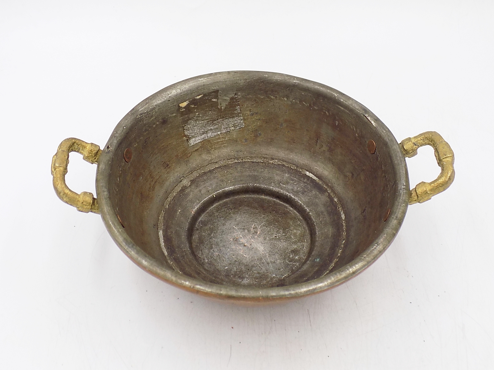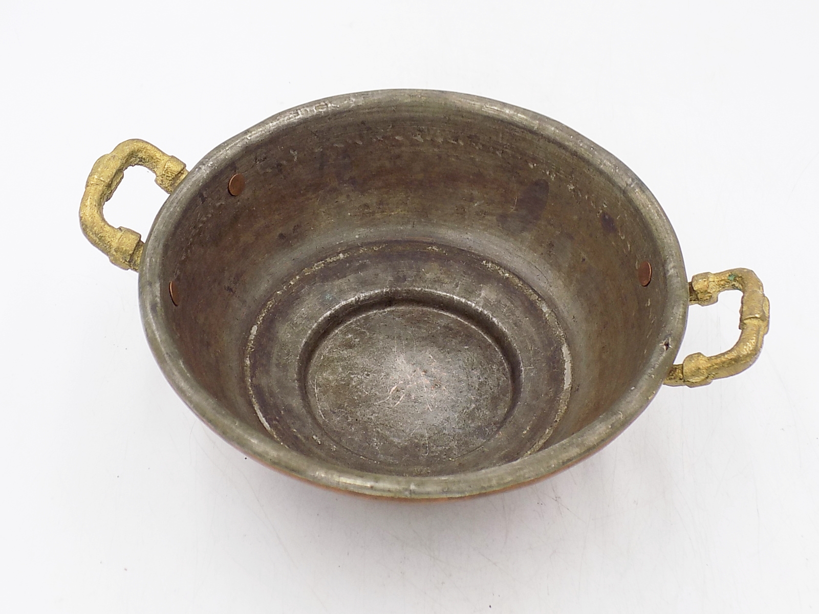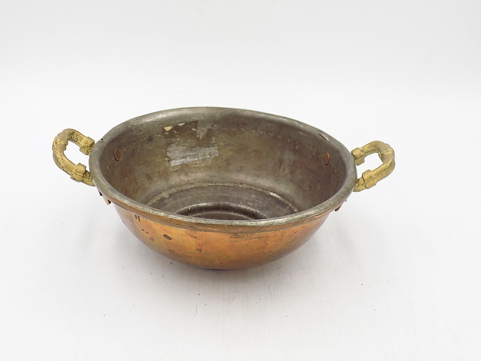 Zabytkowe naczynie z miedzi ocynkowane w środku. Wymiary; wys.6 x 17,5 cm.
