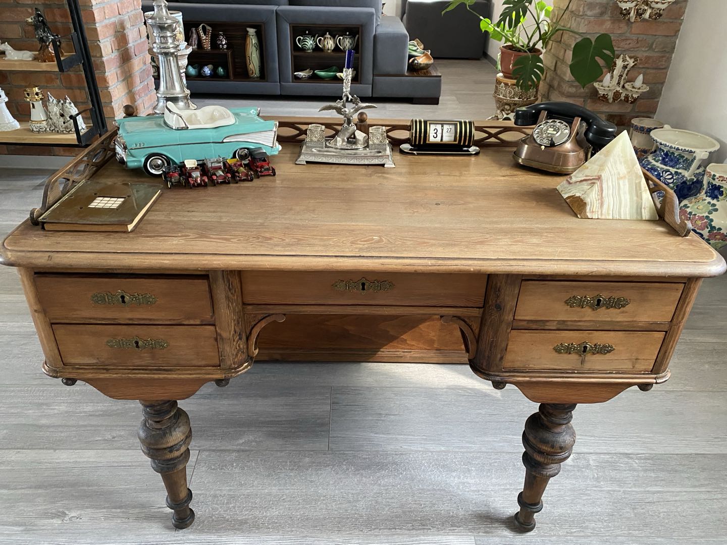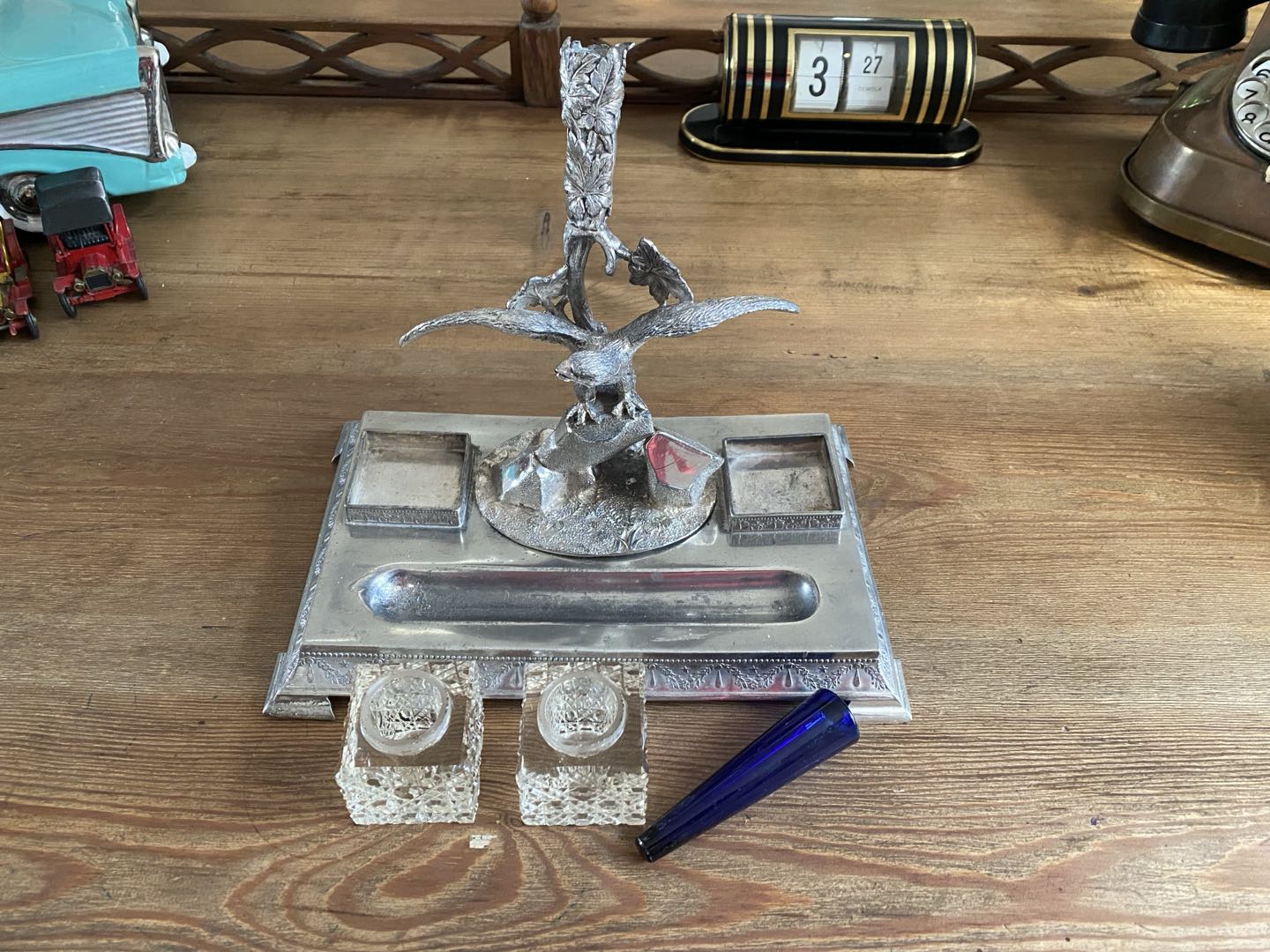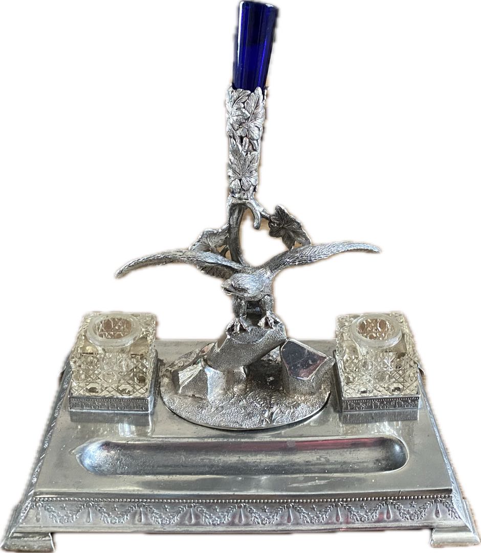 Dekoracyjny kałamarz z firmy James Deakin & son w Sheffield England z lat 1886-1897. Produkt prawdopodobnie wykonany z cynkalu z elementem dekoracyjnym ze szkła przeznaczonym na pióro. Wymiary; wys. 23 x 23 x 15,5 cm.
