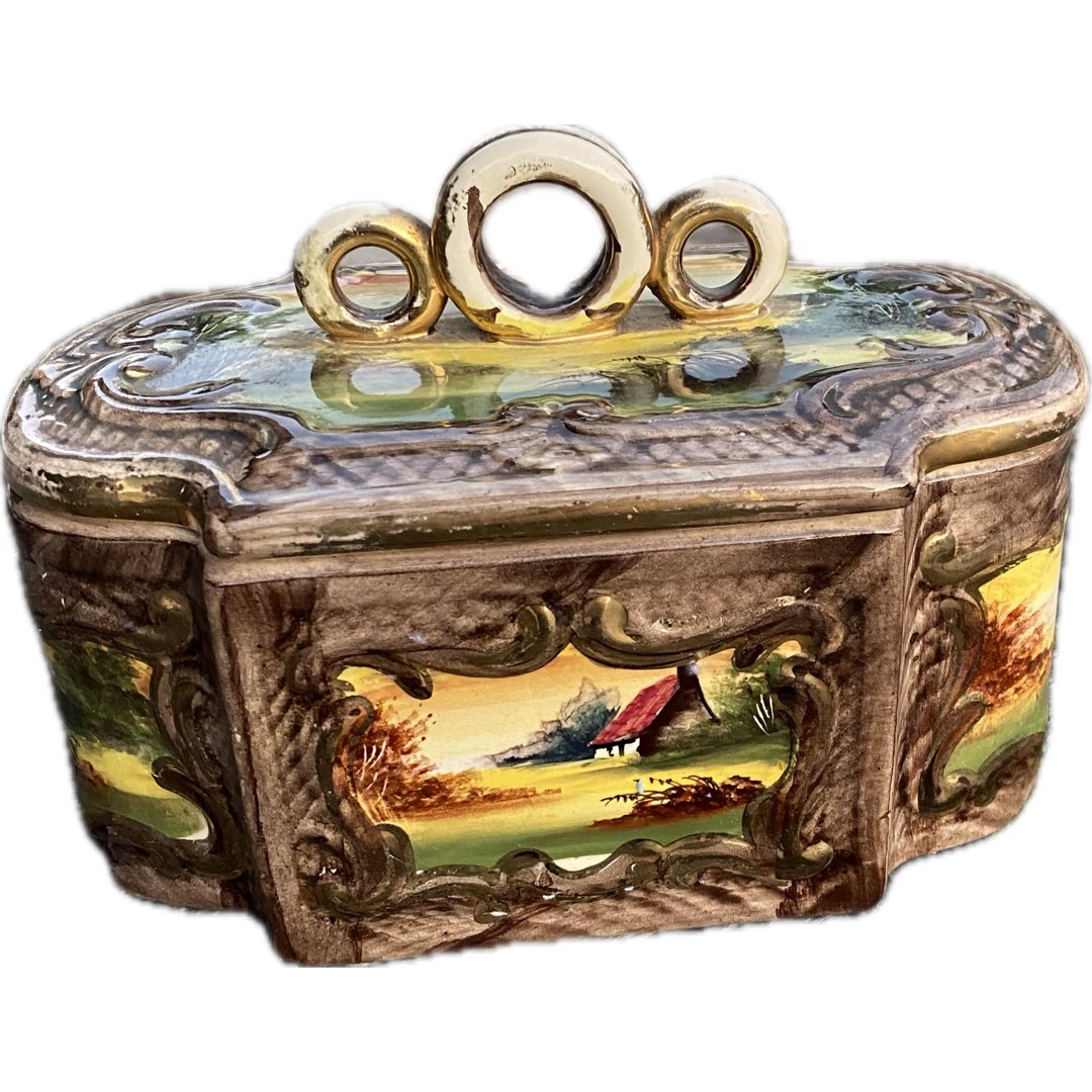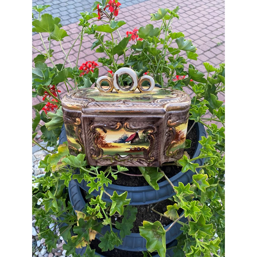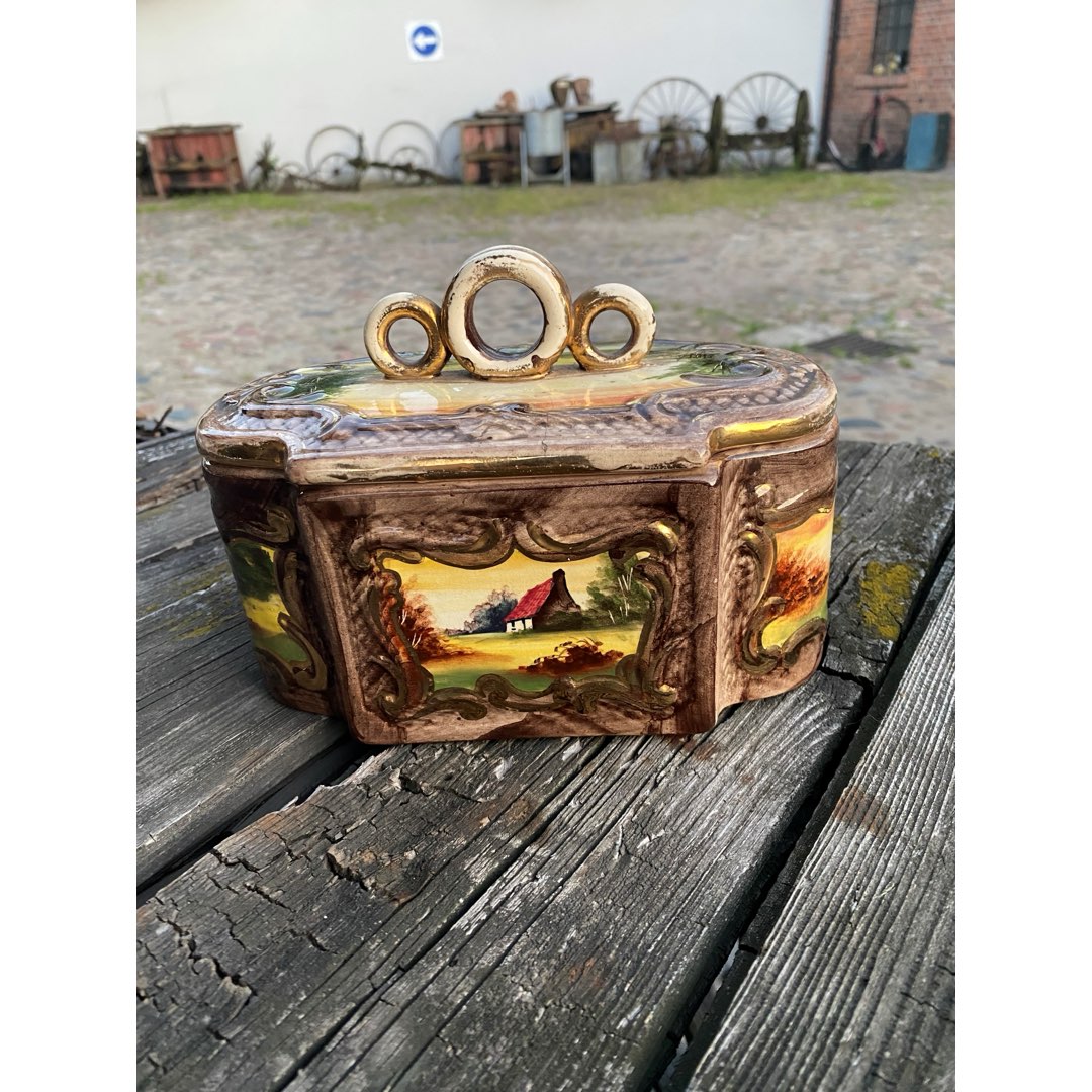 Fajansowy pojemnik na ciasteczka z pocz. XX w. Zwraca uwagę piękna ręczna dekoracja w postaci wiejskich pejzaży. Sygnowany. Wymiary; wis. 13 x 20 x 11,5 cm.