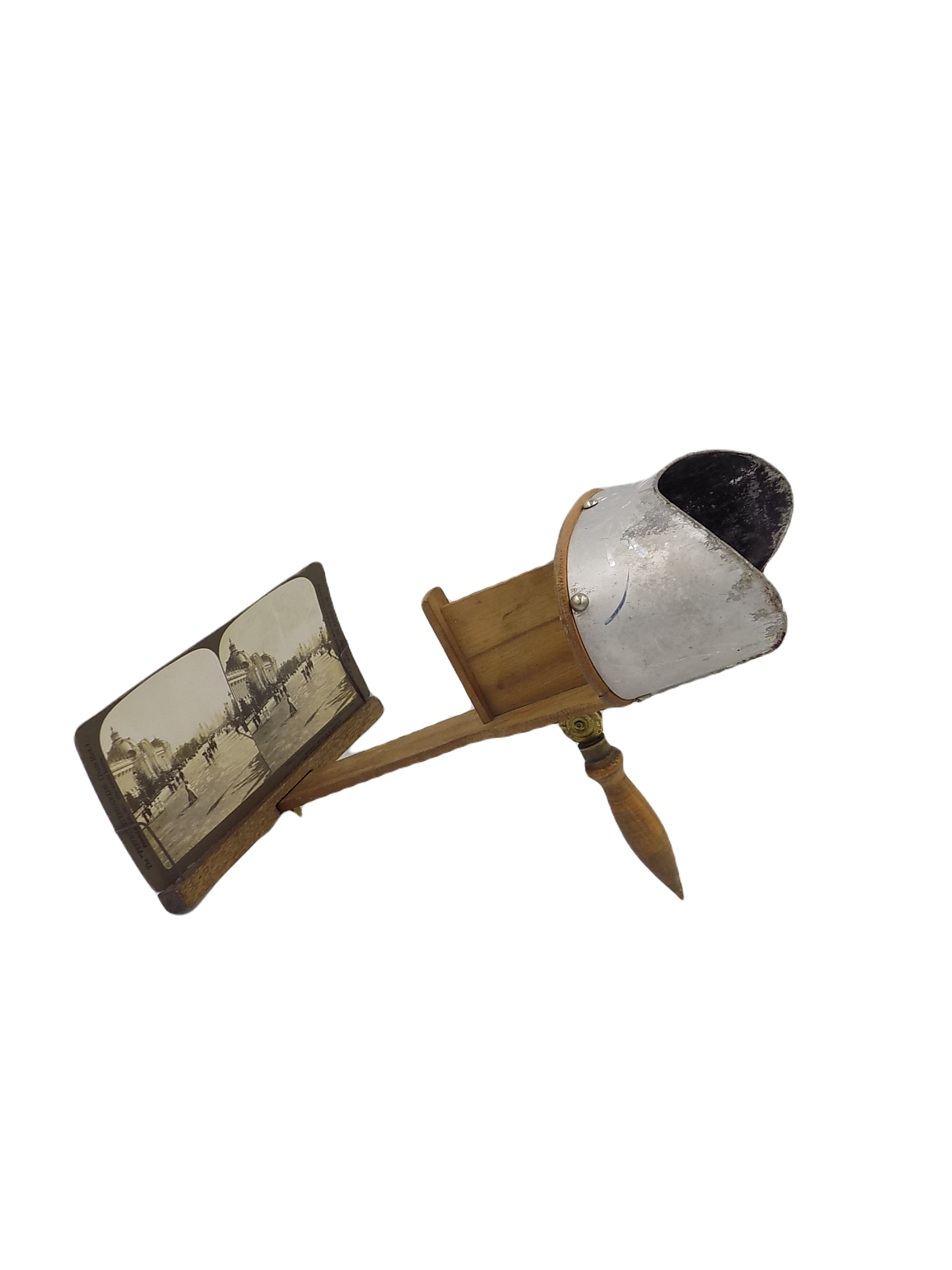 Zabytkowy stereoskop + 5 zdjęć stereoskopowych z końca XIX wieku. Stereoskop jest to przyrząd optyczny, służący do obserwowania fotografii stereoskopowych. Fotografia stereoskopowa składa się z dwóch zdjęć tego samego obiektu, ale wykonanych z różnych punktów widzenia. Patrzący przez stereoskop widz ma wrażenie przestrzenności i trójwymiarowości oglądanej sceny. (źródło; Wikipedia). Wymiary; wys.13,5 x 33 x 6 cm.