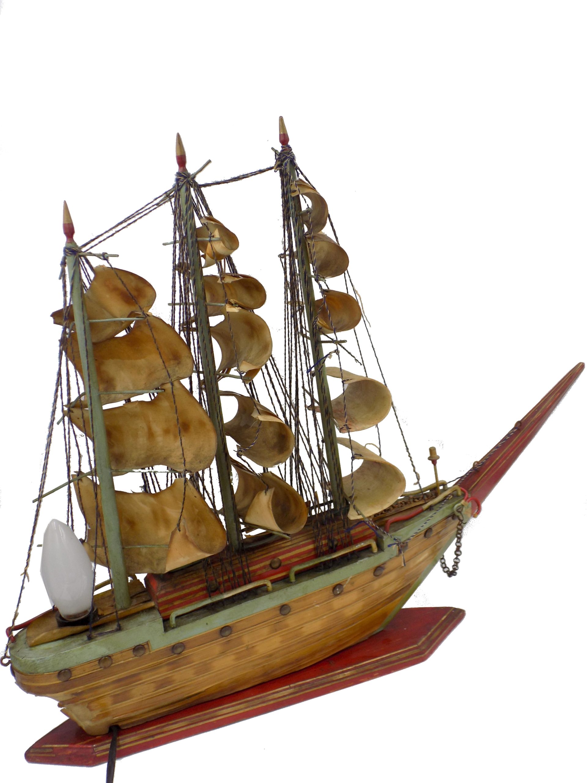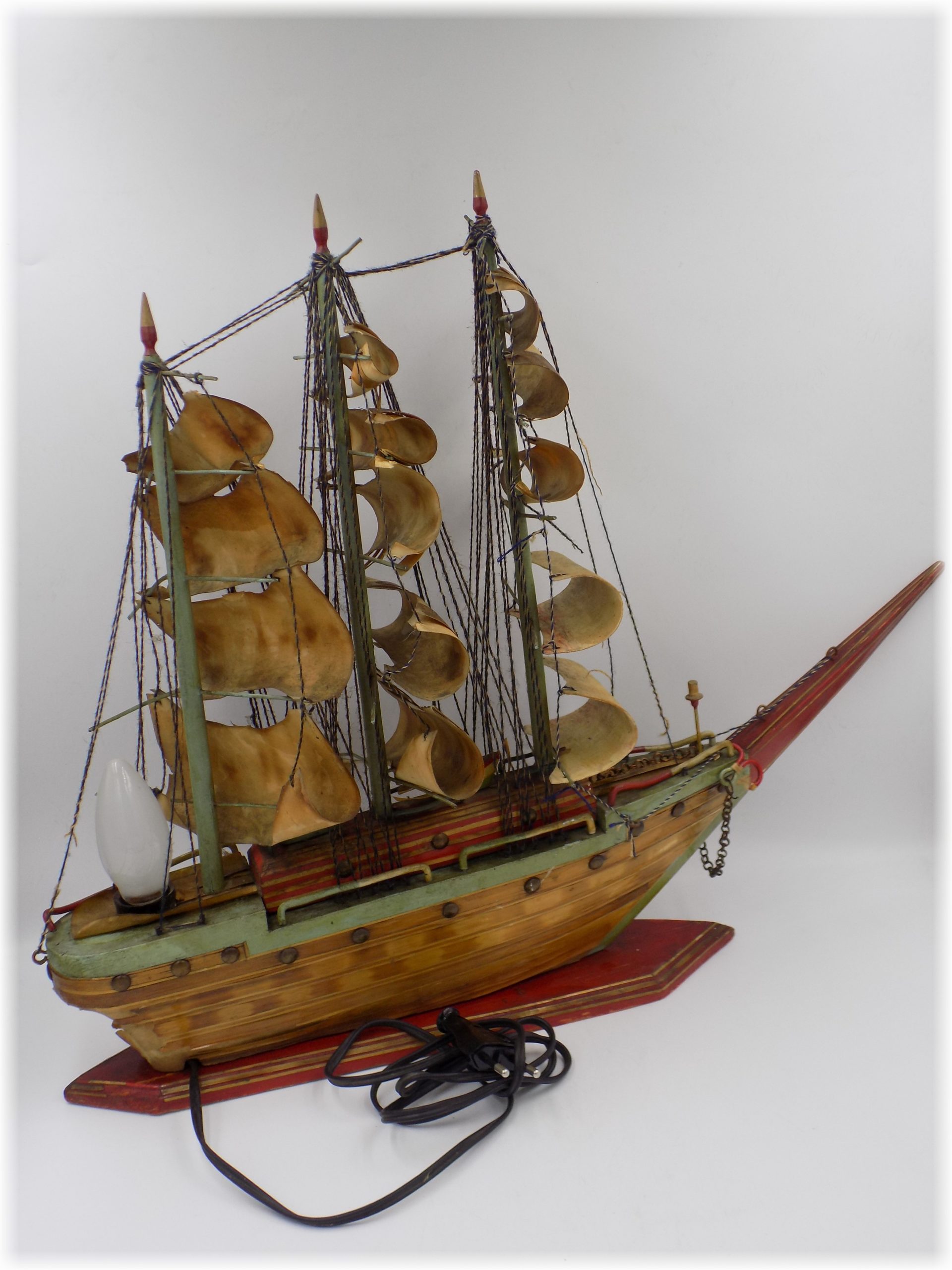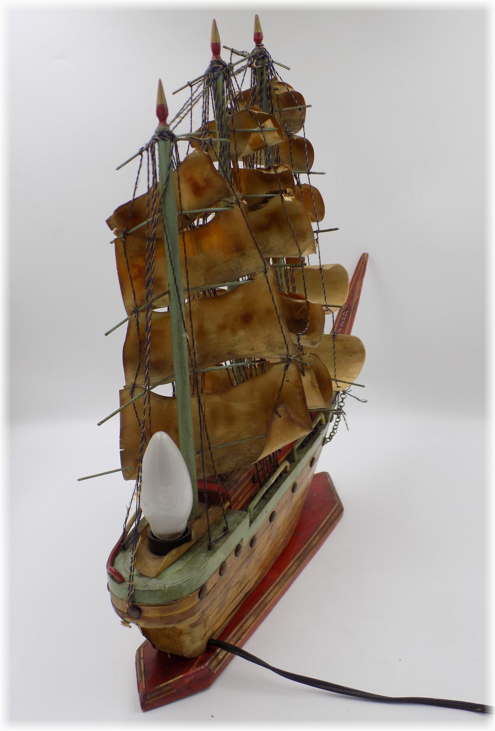 Makieta żaglowca z funkcja lampki z okresu PRL. Wymiary; wys.43,5 x 52 x 12 cm