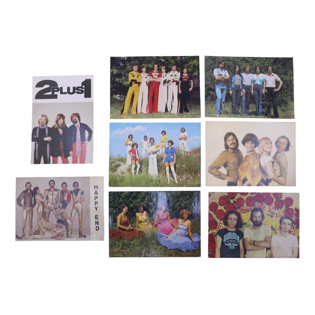 Zestaw 8 pocztówek przedstawiających zespoły wokalne z okresu PRL.