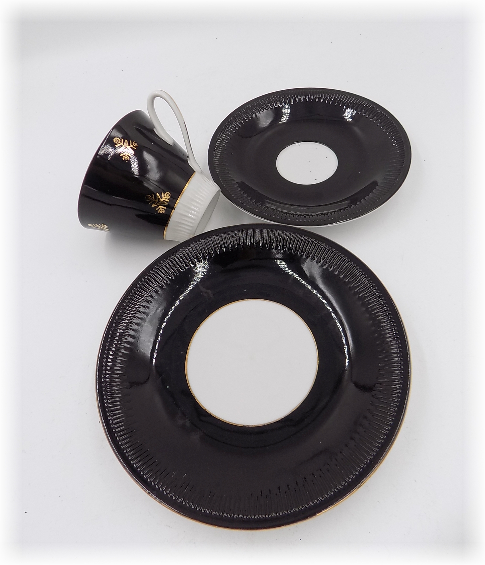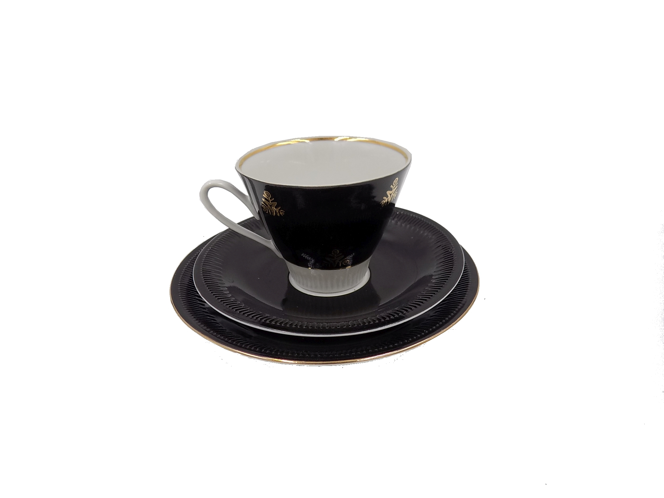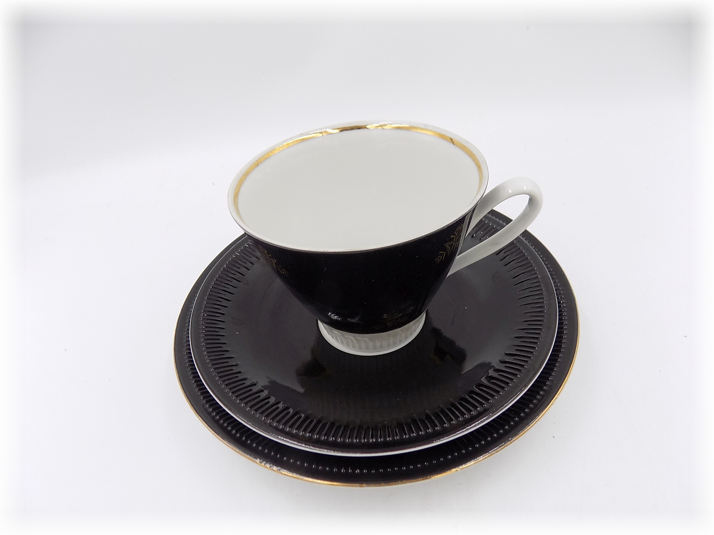 Zestaw śniadaniowy z Fabryki Porcelany we Włocławku. z lat 60-tych. Sygnowany. Wymiary; filiżanka wys.7 x 9 cm, talerzyki 15 i 17 cm