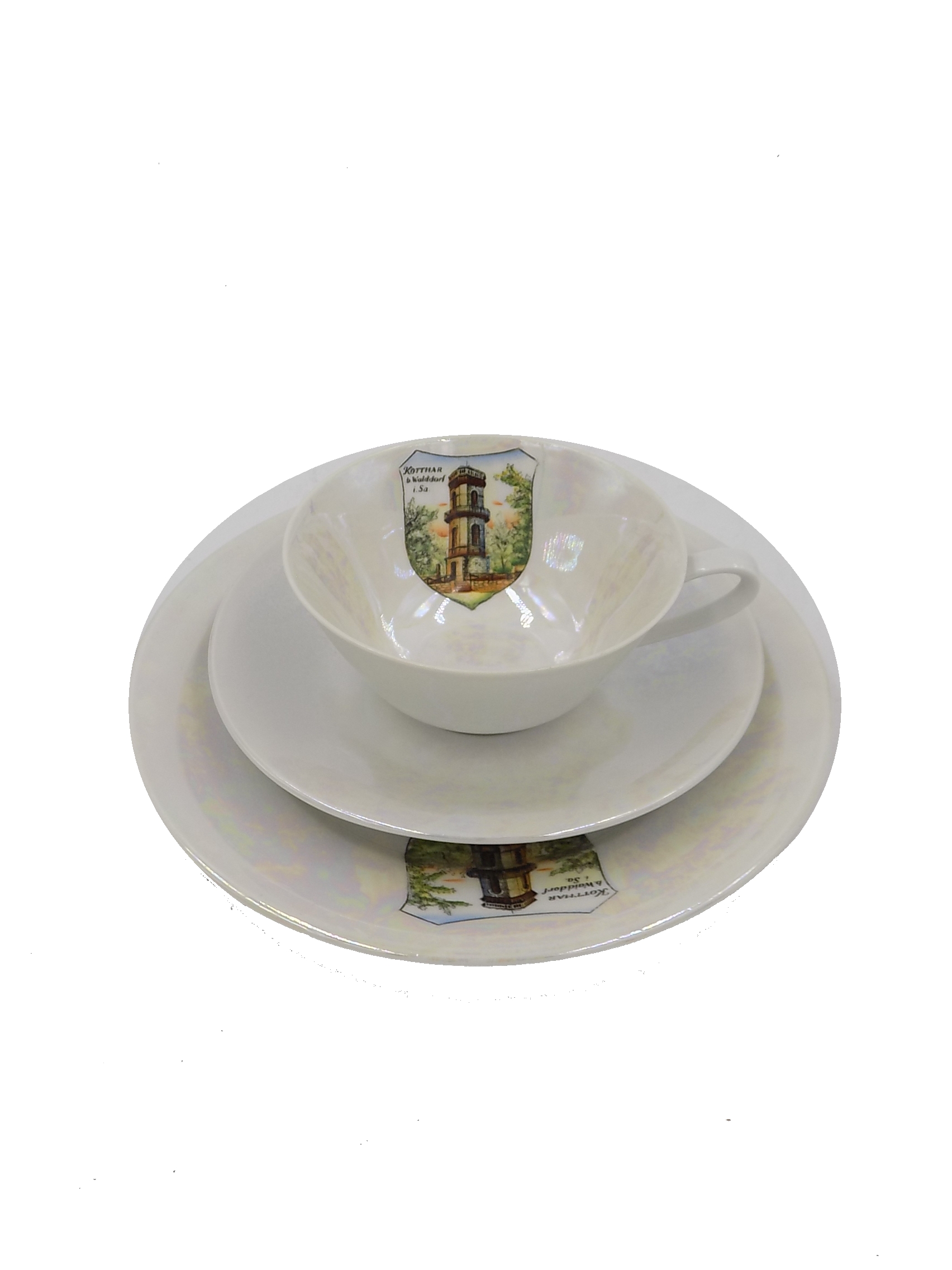 Reklamowy zestaw śniadaniowy z wytwórni porcelany w Weimar Germany. Sygnatura stosowana w latach 1933-45. Wymiary; wys.5 x 10,5 cm, talerzyki 15 i 19,5 cm.